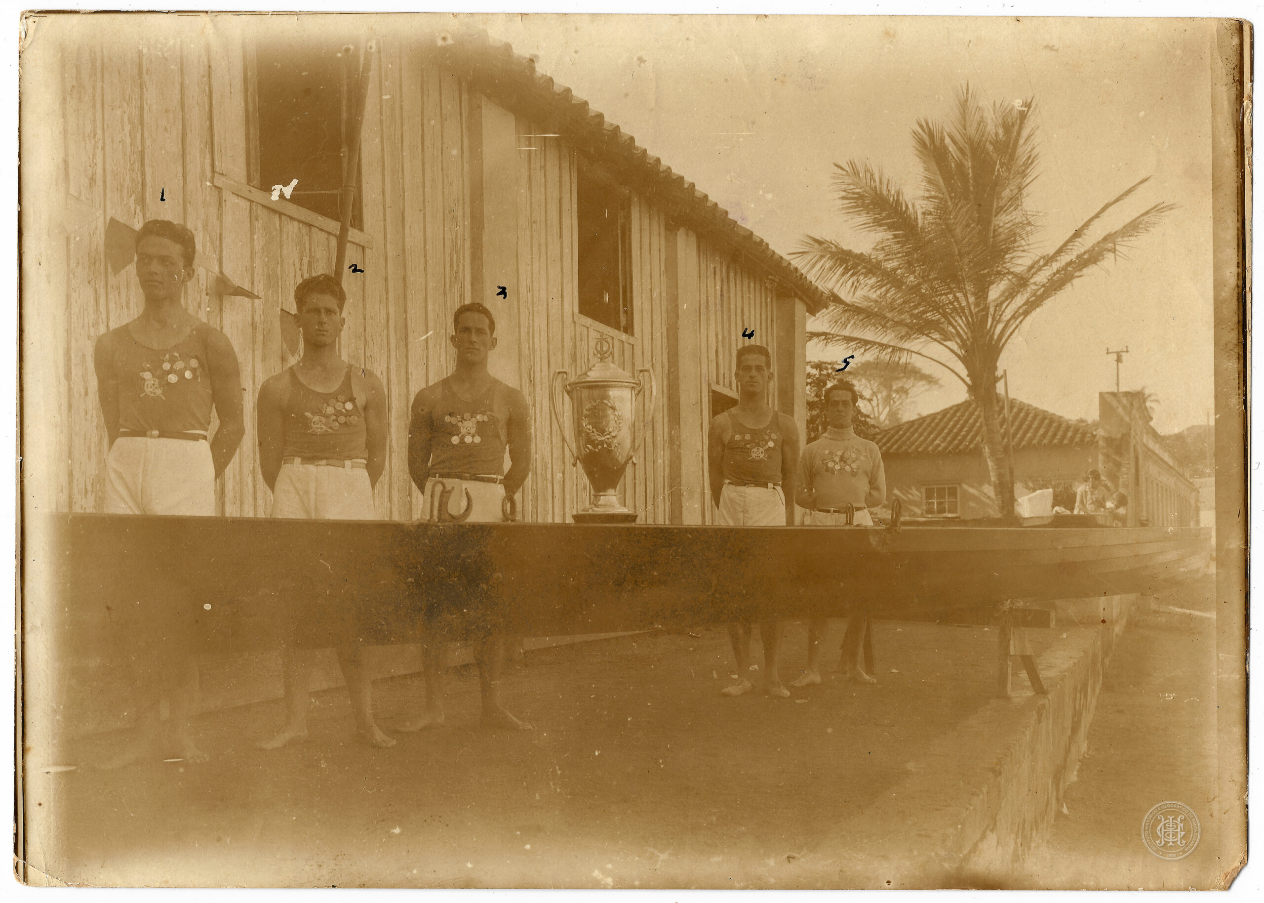 Esta fotografia registra cinco atletas da guarnição do Clube Náutico Riachuelo em Florianópolis, Santa Catarina, no ano de 1900. Em primeiro plano, os remadores estão posicionados em pé, de corpo inteiro e voltados para a frente, atrás de uma embarcação longa e escura (um barco de remo) que atravessa horizontalmente quase toda a extensão da imagem. Da esquerda para a direita, os sujeitos são identificados por números manuscritos flutuando acima de suas cabeças: Mund (1), Muller (2), Muller (3), um atleta não identificado (4) e Décio Couto (5). Os quatro primeiros vestem uniformes compostos por regatas escuras com um emblema claro de faixas cruzadas no peito e calções claros com cintos escuros; os três primeiros exibem medalhas circulares fixadas no lado esquerdo do peito. O quinto atleta, à extrema direita, veste uma camisa de manga longa clara com o mesmo emblema e calções claros. Sobre a embarcação, centralizado entre os atletas 3 e 4, encontra-se um troféu metálico de grandes proporções com duas alças laterais e ornatos em relevo.