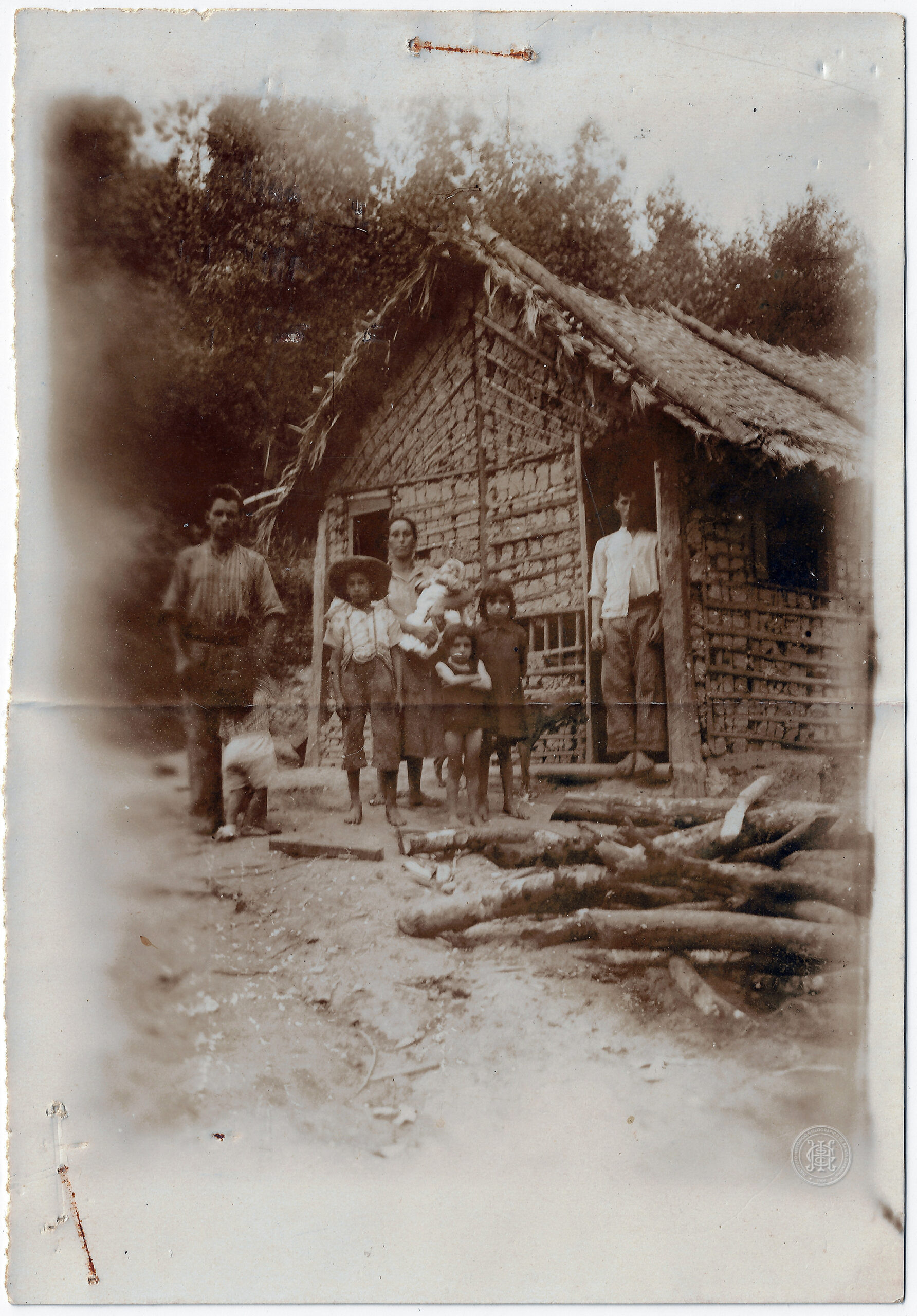 Retrato coletivo de uma família em frente a uma habitação rural de construção rústica no município de Orleans, Santa Catarina. A edificação, identificada no verso como uma casa de pau a pique, possui paredes de barro amassado sobre trama de madeira visível e cobertura de palha ou sapé.