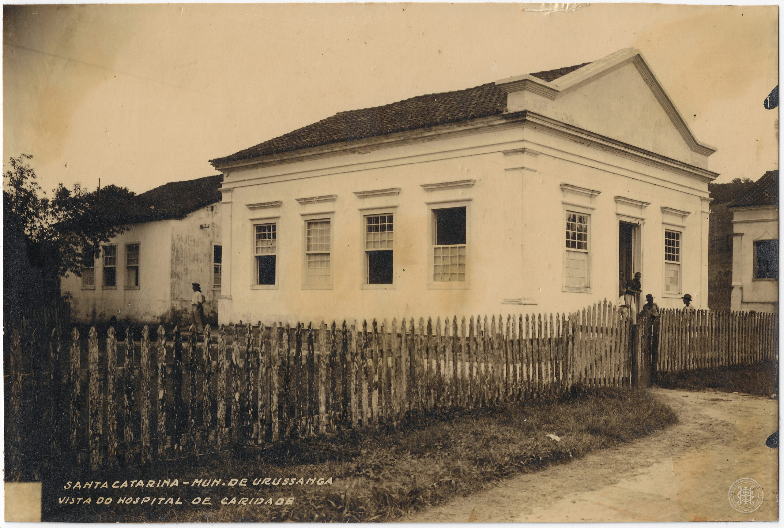 À direita, uma via de terra batida conduz ao portão de entrada, onde se encontram posicionados três sujeitos masculinos em pé, vestindo calças escuras, camisas claras e chapéus. À esquerda da edificação principal, observa-se o prolongamento de outro corpo do edifício com mais janelas visíveis e um sujeito caminhando em perfil. No canto inferior esquerdo do anverso, constam inscrições em letras maiúsculas brancas sobrepostas: SANTA CATARINA - MUN. DE URUSSANGA; VISTA DO HOSPITAL DE CARIDADE.