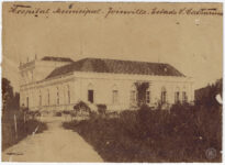 À frente da construção, observa-se uma via de terra batida que conduz a um portão de madeira em estilo ripado. O entorno é composto por vegetação arbustiva densa em primeiro plano e árvores de maior porte ao fundo, à esquerda. Na parte superior do anverso, consta uma inscrição manuscrita a tinta identificando a instituição e a localidade.