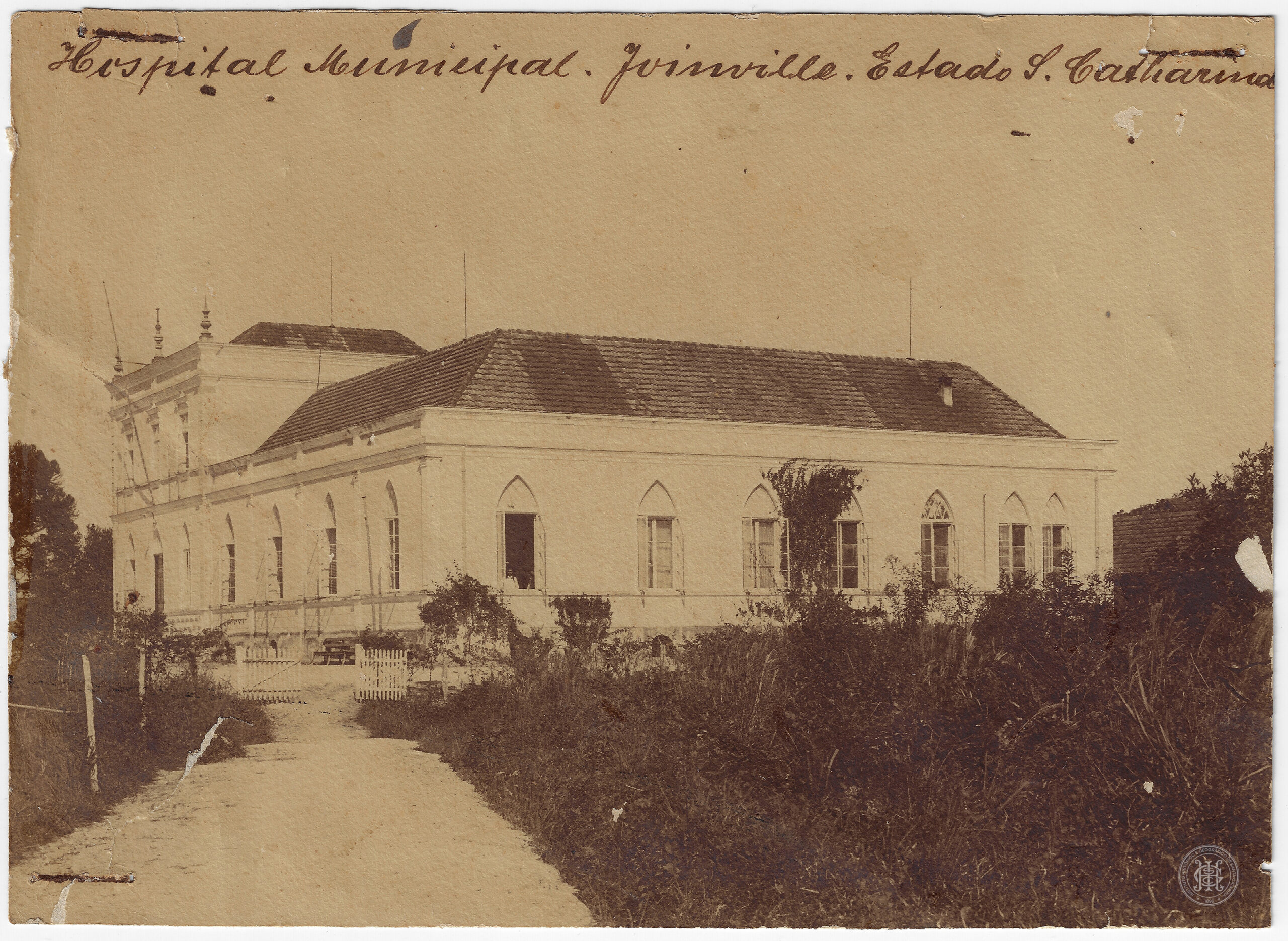 Hospital Municipal de Joinville, Santa Catarina. A edificação apresenta uma linguagem arquitetônica eclética com elementos neogóticos, destacados pelas aberturas em arco ogival (apontado) que se distribuem regularmente ao longo da fachada lateral.