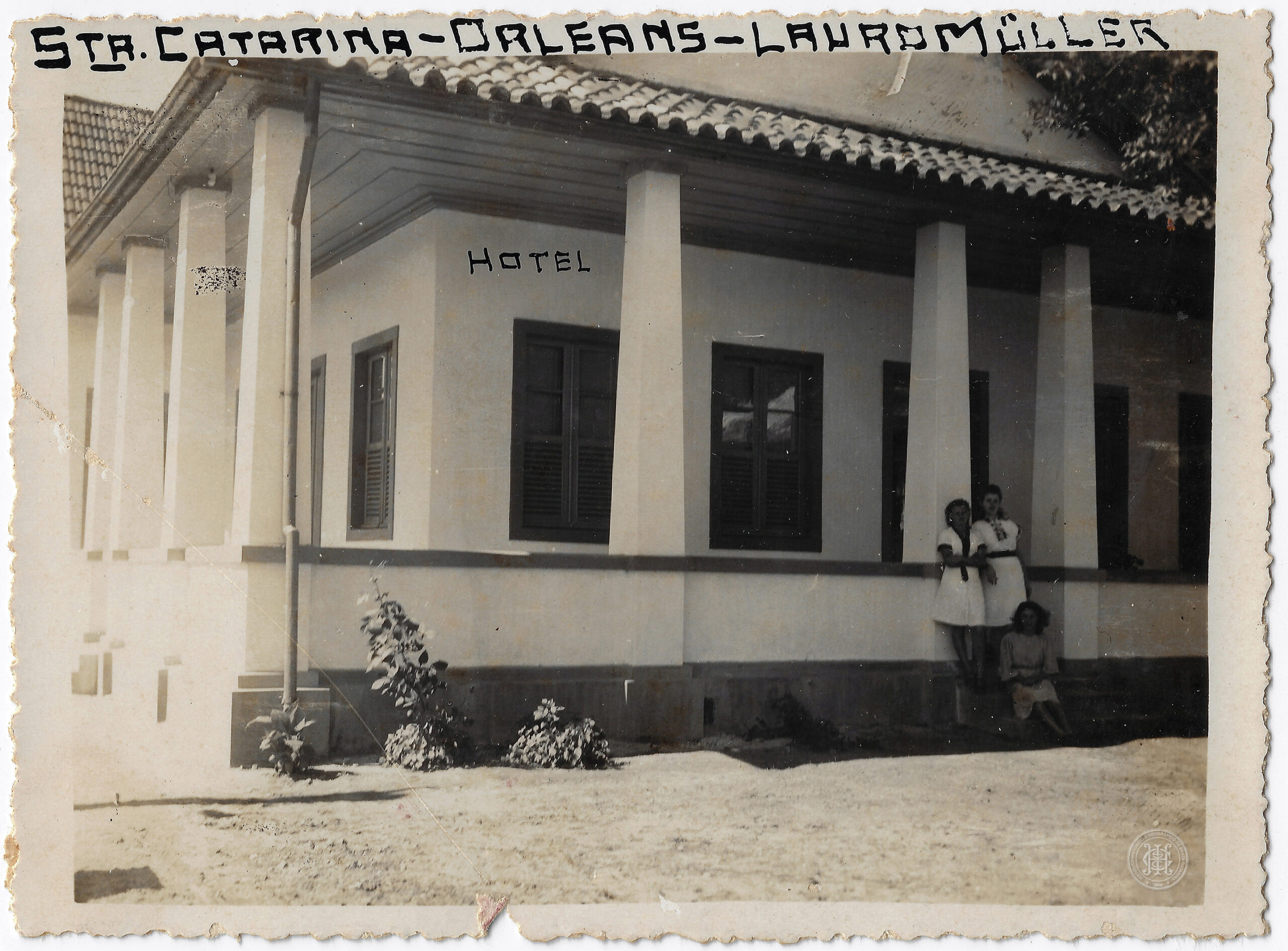 Na parte superior da fachada, abaixo do telhado, consta a inscrição "HOTEL". No topo da margem superior do anverso, há a inscrição manuscrita em tinta preta e letras maiúsculas: "STA. CATARINA - ORLEANS - LAURO MÜLLER".