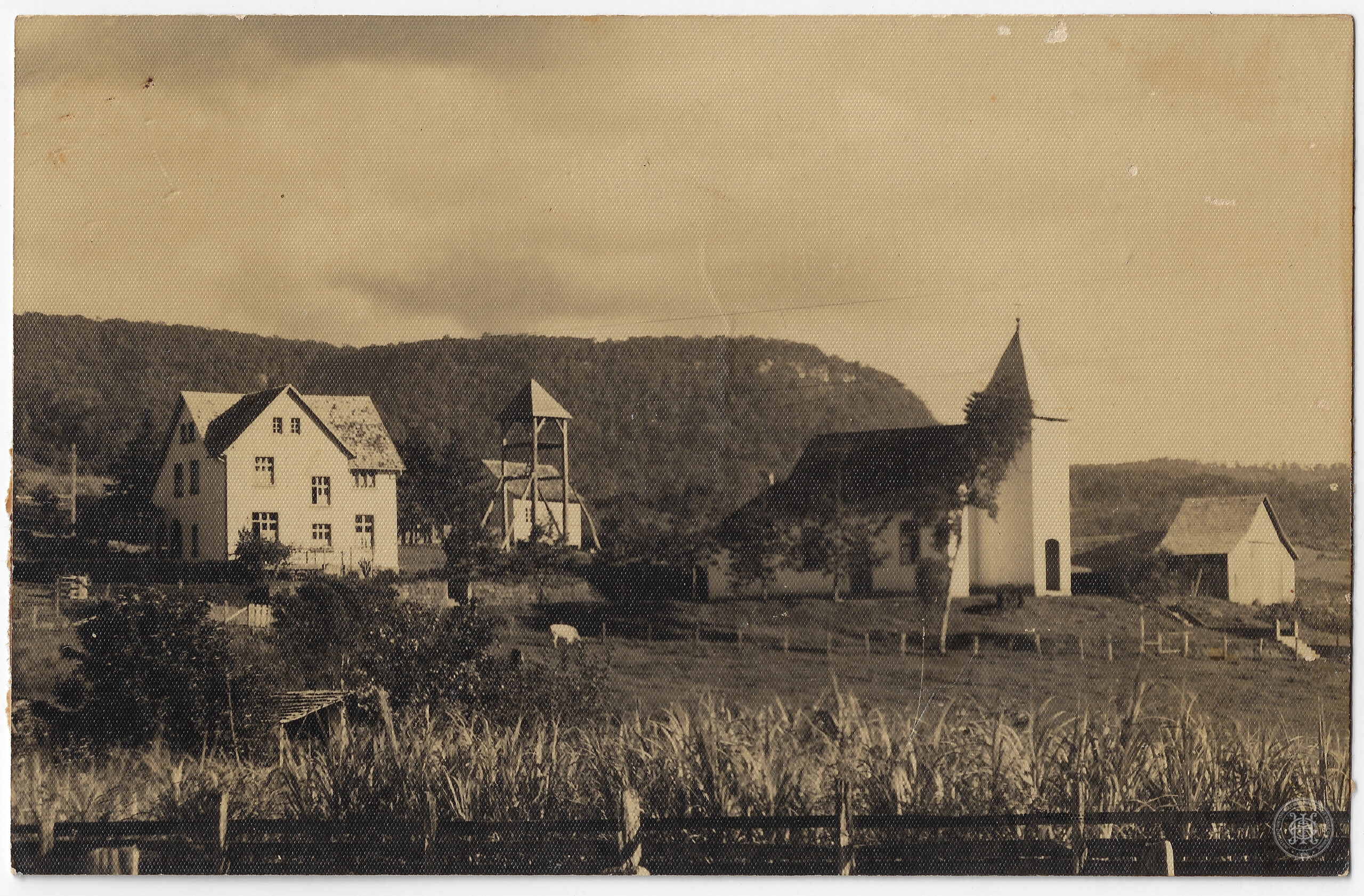 No primeiro plano, há uma área de vegetação rasteira e arbustiva, com destaque para o que aparenta ser um cultivo de gramíneas ou canavial à frente de uma cerca de madeira horizontal. Um bovino é visível no gramado entre a residência e a igreja.
