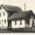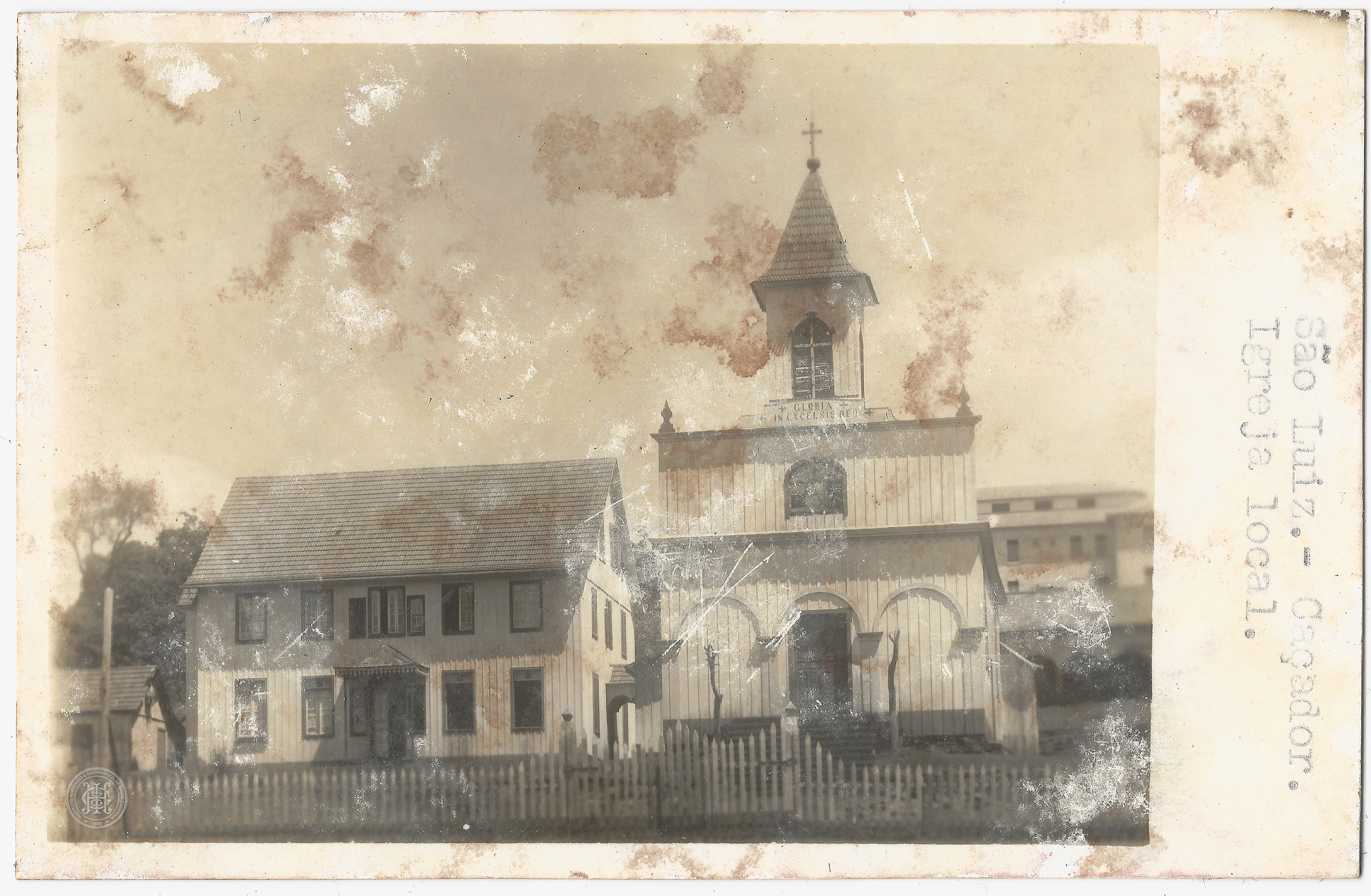Fachada frontal de uma igreja e de uma residência adjacente no antigo distrito de São Luiz (atual Iomerê), no município de Caçador, Santa Catarina. A igreja, posicionada à direita, apresenta uma estrutura em madeira com tábuas verticais, composta por um corpo principal de dois pavimentos e uma torre central que culmina em um pináculo piramidal com uma cruz no topo. Na base da torre, observa-se uma janela em arco com venezianas, e acima da porta principal, um frontão reto com a inscrição "GLORIA IN EXCELSIS DEO".