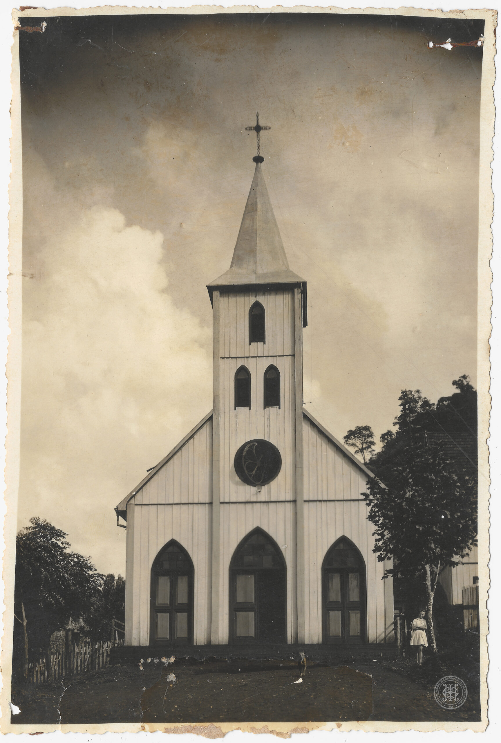 Igreja Matriz, Arquitetura Religiosa, Edificação Religiosa, Templo, Igreja de Madeira, Arquitetura em Madeira, Arco Ogival, Torre, Coruchéu, Cruz, Fachada, Joaçaba, Cruzeiro, Santa Catarina, Meio-Oeste Catarinense, Patrimônio Arquitetônico, Urbanização, Praça, Figura Humana, Mulher, Árvores, Vegetação, Solo de terra