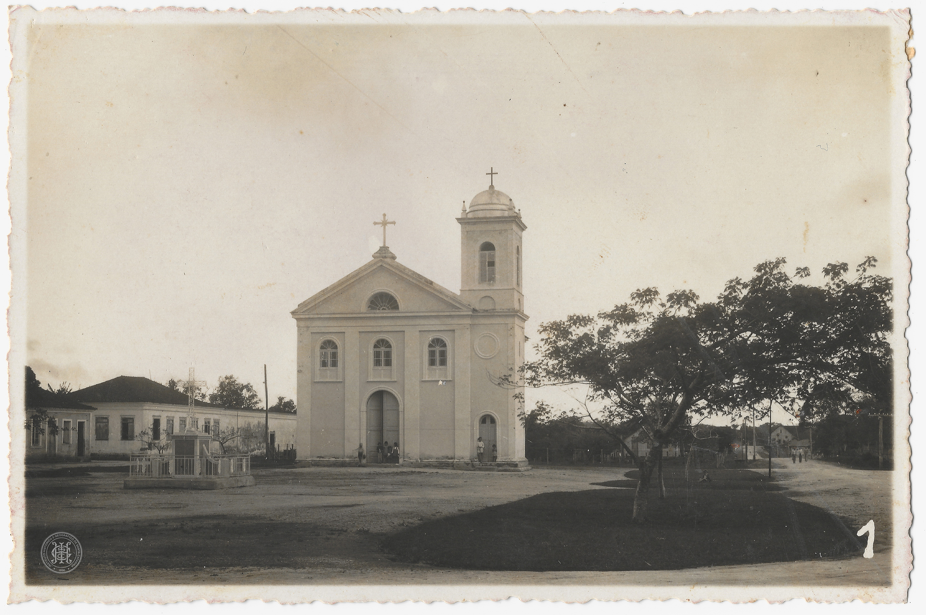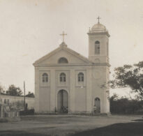 Esta fotografia em tons de sépia, com orientação horizontal e bordas serrilhadas, registra em plano médio a fachada da Igreja Matriz "Santuário Bom Jesus" de Araquari, Santa Catarina. A edificação religiosa apresenta arquitetura de influência luso-brasileira, composta por um corpo principal de dois pavimentos com frontão triangular encimado por uma cruz metálica e uma torre sineira à direita, com cúpula bulbosa também rematada por uma cruz.