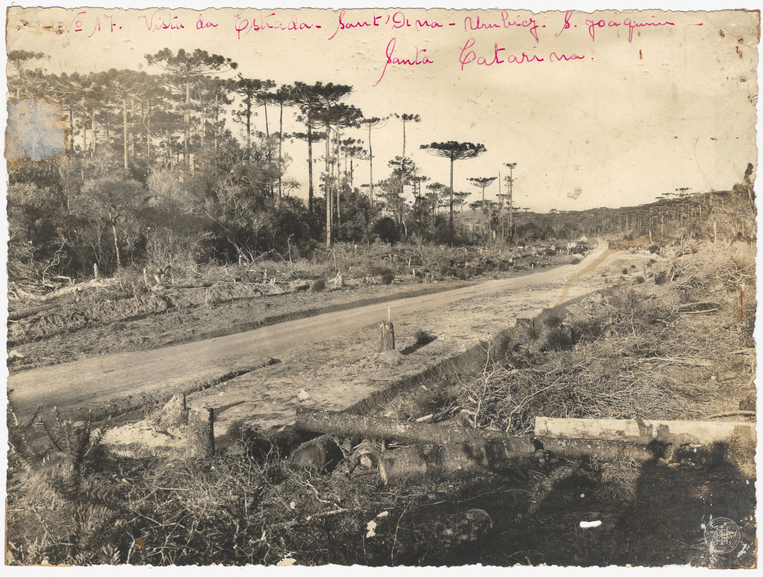 A estrada corta o centro da composição partindo do primeiro plano, apresentando marcas de terraplanagem e valetas laterais para escoamento. Na margem superior do anverso, a cena é identificada pela inscrição manuscrita em tinta vermelha: "No 17. Vista da Estrada - Sant' Anna - Urubicy. S. Joaquim - Santa Catarina", unindo os antigos distritos de Santana (Urupema) e Urubici.