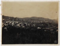 A composição organiza-se em três planos distintos: o primeiro plano é dominado por vegetação rasteira e arbustiva escura, que ocupa a base da imagem; o plano médio revela um adensamento de edificações predominantemente térreas, com telhados de duas e quatro águas, dispostas de forma irregular ao longo da topografia; no plano de fundo, observa-se uma elevação de morro com vegetação densa sob um céu claro e uniforme.