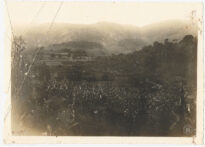 O plano de fundo é composto por uma sucessão de elevações montanhosas que se estendem por todo o horizonte, sob um céu claro. A perspectiva é profunda, enfatizando a extensão da topografia local e a ocupação agrícola do solo.