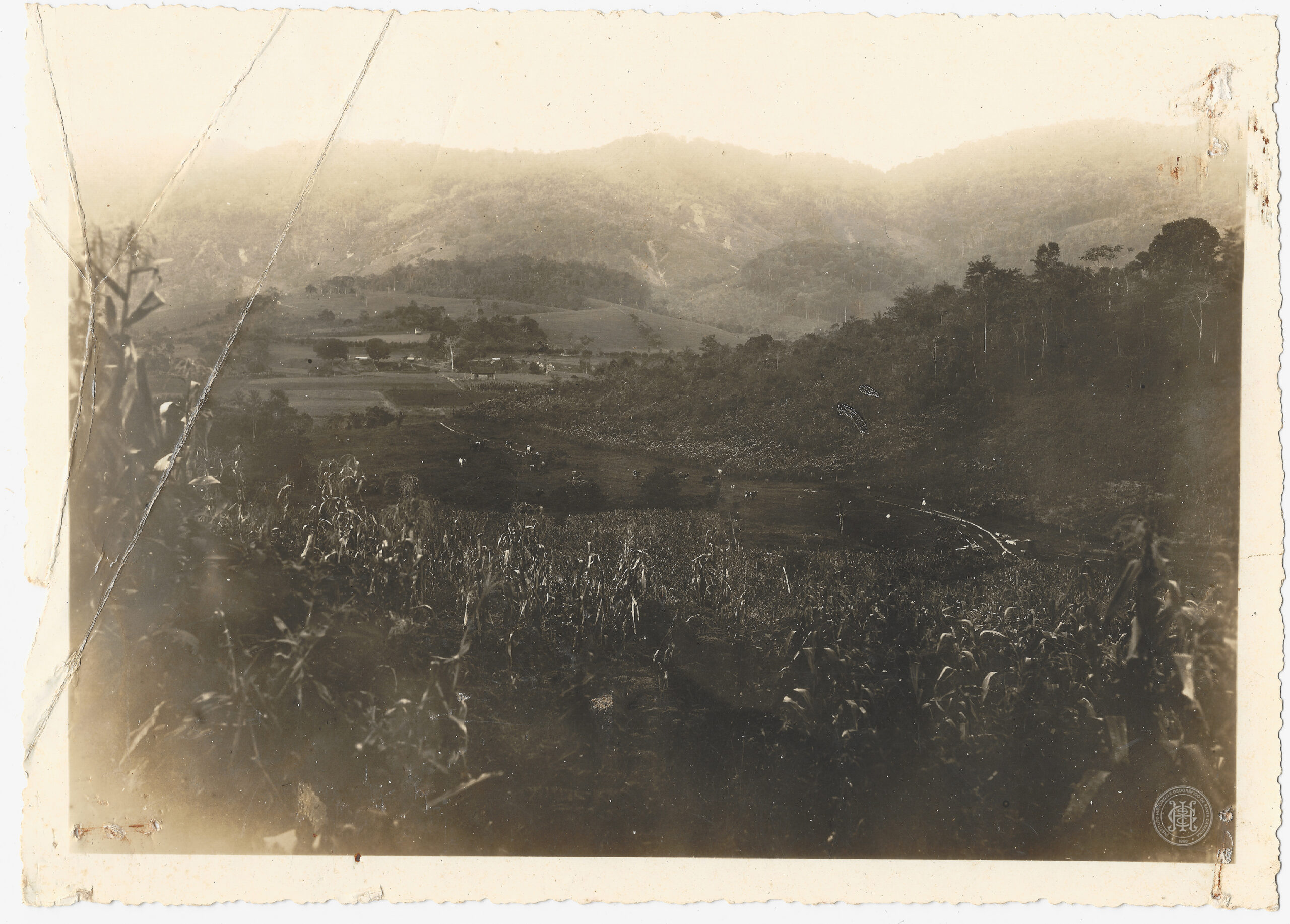 No plano médio, à esquerda, observa-se uma área de campo aberto com pequenas edificações rurais dispersas e áreas de pastagem ou cultivo. À direita, a encosta de um morro é coberta por vegetação densa e arbórea.