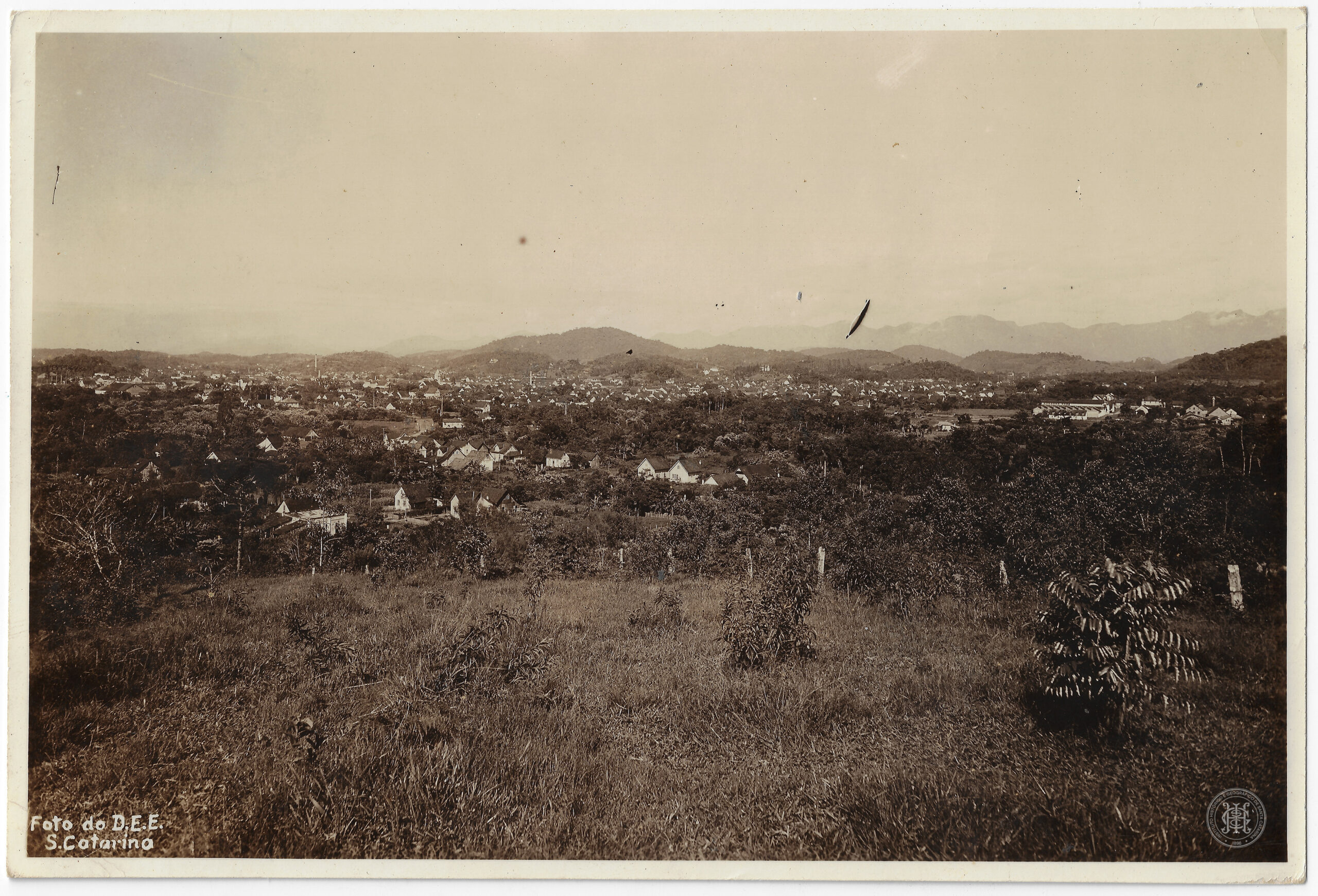 Vista panorâmica, Paisagem urbana, Joinville, Santa Catarina, Edificações residenciais, Arquitetura, Vegetação, Árvores, Relevo, Morros, Montanhas, Cidades catarinenses, Cartão-postal paisagístico, Década de 1940, Década de 1950, Espaços urbanos, Horizonte, Relevo montanhoso, Departamento Estadual de Estatística