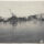 A imagem organiza-se em três planos principais que destacam a magnitude da estrutura de engenharia em relação ao ambiente urbano e marítimo. Em primeiro plano, observa-se o pátio do canteiro de obras em solo firme, repleto de vigas metálicas treliçadas e perfis de aço empilhados de forma organizada sobre o terreno. No plano médio, erguem-se duas monumentais torres metálicas de treliça, conectadas no topo por uma viga horizontal, formando um pórtico que sustenta equipamentos de elevação, como guindastes de torre e polias. É possível identificar diversas figuras humanas (trabalhadores) posicionadas tanto no solo quanto em diferentes níveis da estrutura metálica, evidenciando a escala da construção. À esquerda, destaca-se a base de um maciço pilar de concreto (encontro) com detalhes arquitetônicos e pinos de fixação.