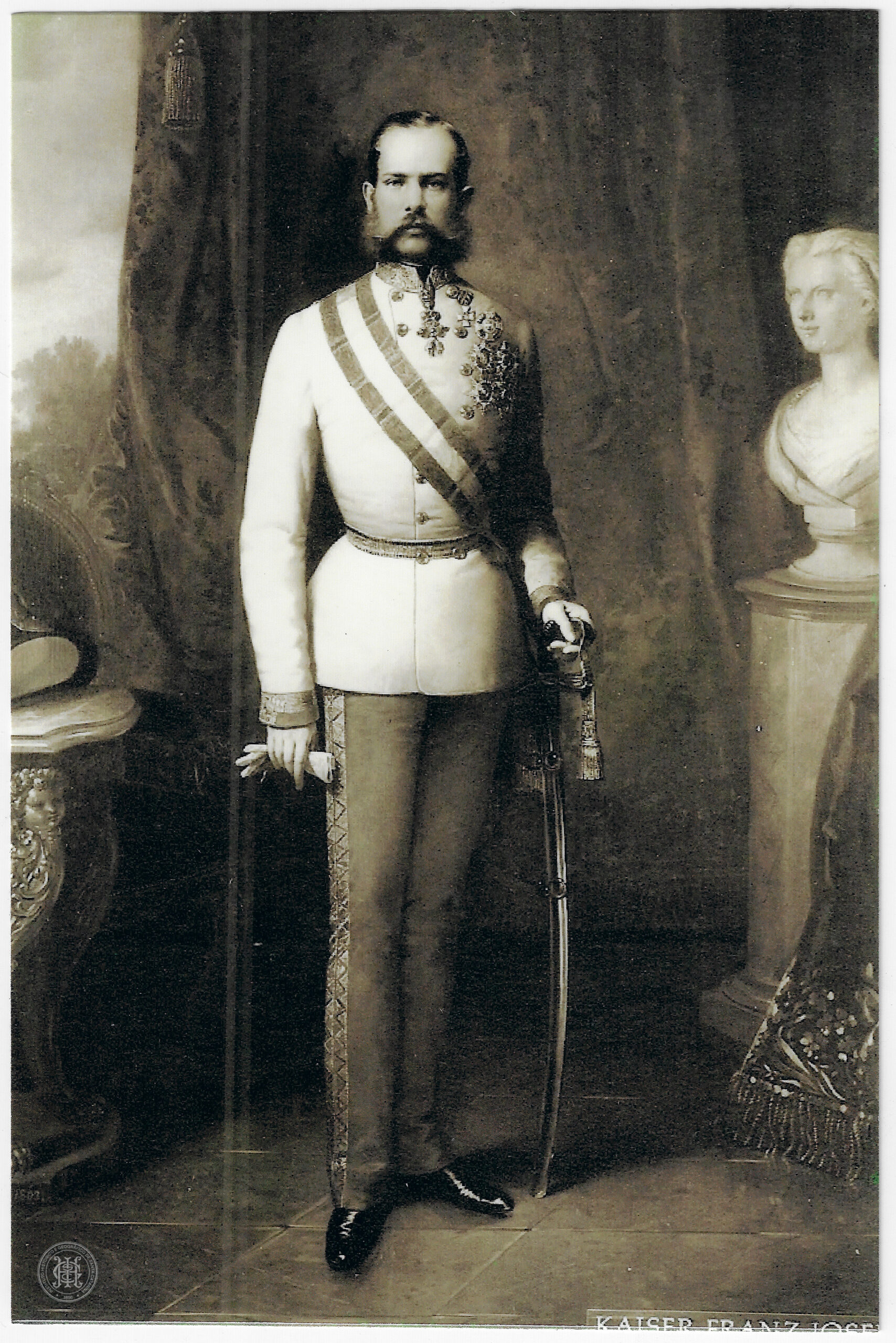A imagem está contida em um enquadramento oval, inserido em um suporte retangular de cor creme. Abaixo da imagem, na margem inferior, observa-se a inscrição impressa "Kaiser Franz Joseph I. v. Oesterreich" e o crédito do fotógrafo "LUDW. ANGERER k.k. Hof-Photograph WIEN", acompanhado por um brasão de armas.