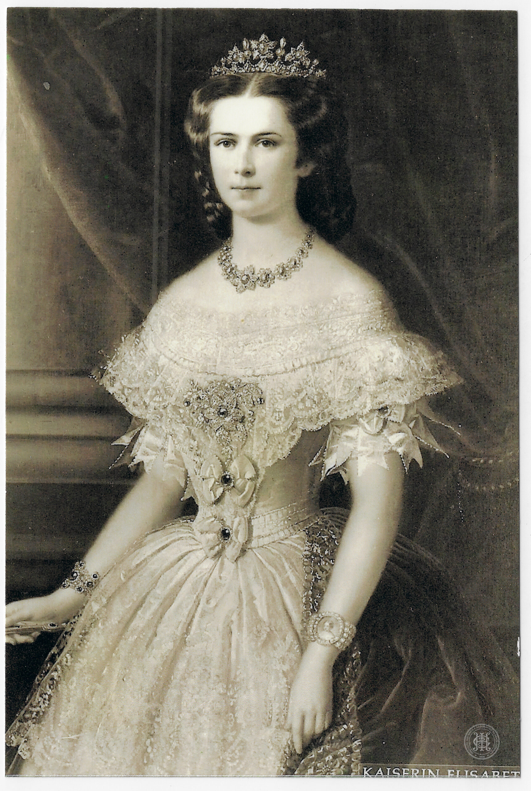 Este registro apresenta o retrato oficial de plano médio da Imperatriz Elisabeth da Áustria. A figura feminina, uma mulher jovem de pele clara, está centralizada e posicionada levemente em três quartos para a esquerda, com o olhar fixo à frente. O penteado é elaborado, com os cabelos escuros presos para trás em tranças e adornados por uma tiara ou coroa cravejada de joias. A indumentária é composta por um vestido de gala de cintura afinada e colo desnudo, caracterizado por amplas camadas de renda e brocados no decote e nas mangas curtas, além de detalhes em laços de fita com pedrarias centrais ao longo do torso.