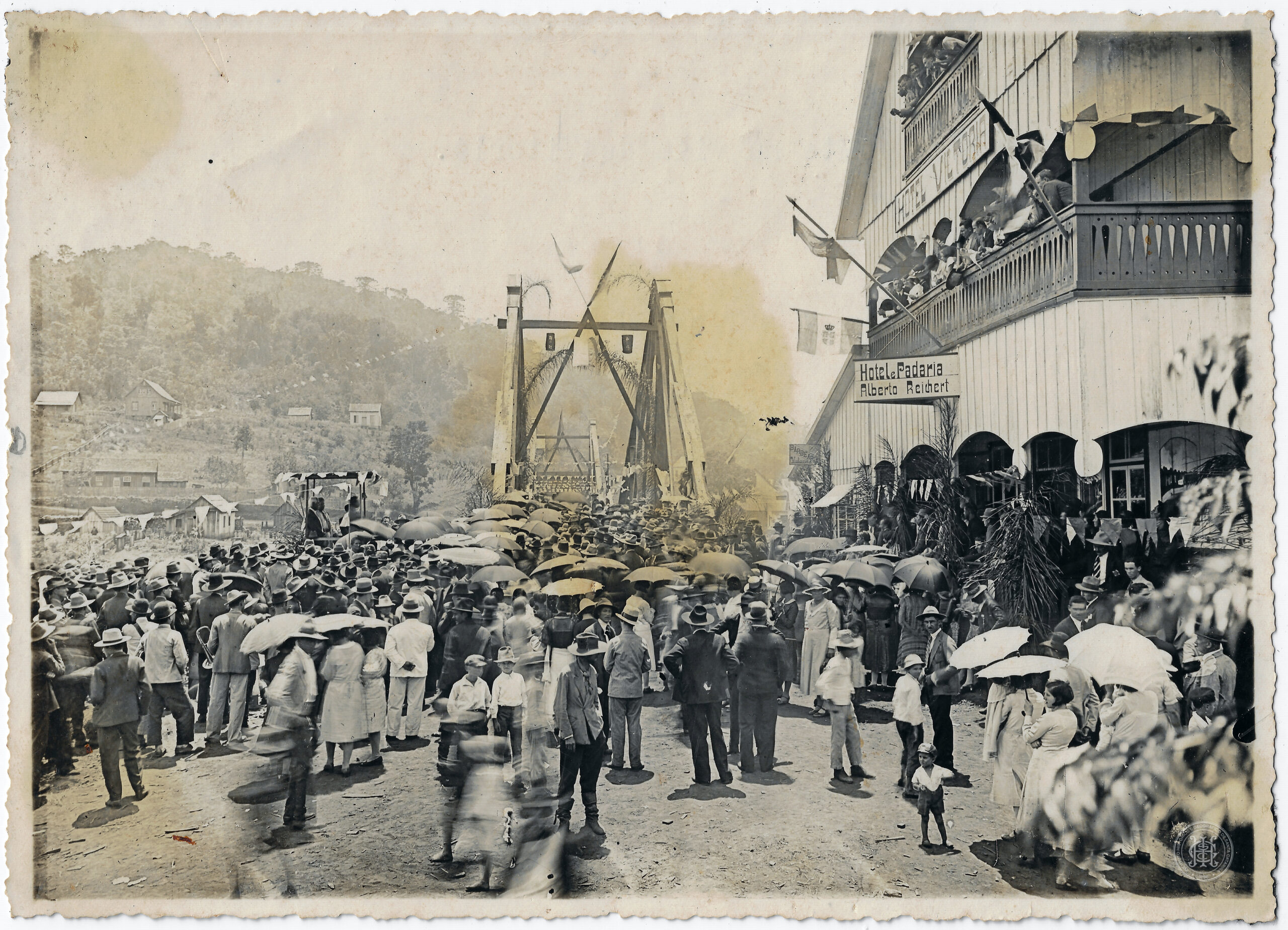 Inauguração de obra, Ponte Luiz Kellermann, Ponte de madeira, Distrito de Vitória, Videira, Caçador, Santa Catarina, Hotel Vitória, Hotel e Padaria Alberto Reichert, Alberto Reichert, Arquitetura de Madeira, Edificações Comerciais, População, Multidão, Grupos Sociais, Vestuário Formal, Chapéu, Sombrinha, Bandeiras, Ornamentação, Paisagem Urbana, Relevo, Morro, Rio