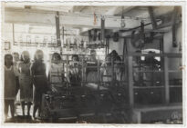 Fábrica, Indústria Têxtil, Fitas de seda, Otto Schaefer, Trabalho feminino, Operárias, Mulheres, Adolescentes, Maquinário, Engenhos, Produção fabril, Interior, Arquitetura industrial, Maquinaria têxtil, Bobinas, Carretéis, Brusque, Santa Catarina, Vale do Itajaí, Fotografia documental, Registro de trabalho, História econômica