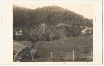 O plano de fundo é preenchido por uma elevação montanhosa densamente coberta por vegetação de Mata Atlântica, destacando-se alguns troncos claros de árvores contra a folhagem escura. A imagem registra também postes de madeira para fiação elétrica ou telegráfica distribuídos ao longo da encosta, indicando intervenção infraestrutural na área rural.