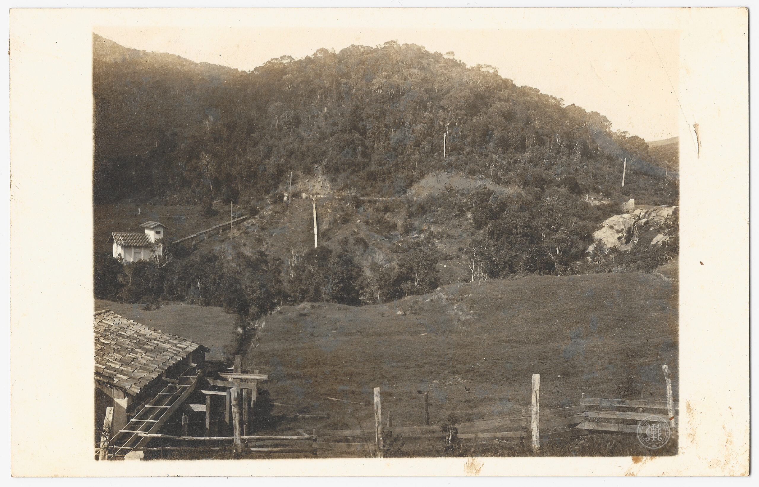 Paisagem Rural, Interior, Relevo Montanhoso, Morro, Mata Atlântica, Vegetação Nativa, Floresta, Pastagem, Cerca de Madeira, Edificação Rural, Arquitetura Vernácula, Telhado de Barro, Canalização de Água, Infraestrutura Rural, Postes de Madeira, São Pedro de Alcântara, São José, Santa Catarina, Grande Florianópolis, Cartão-postal, Fotografia Documental, Patrimônio Edificado, Espaços Rurais