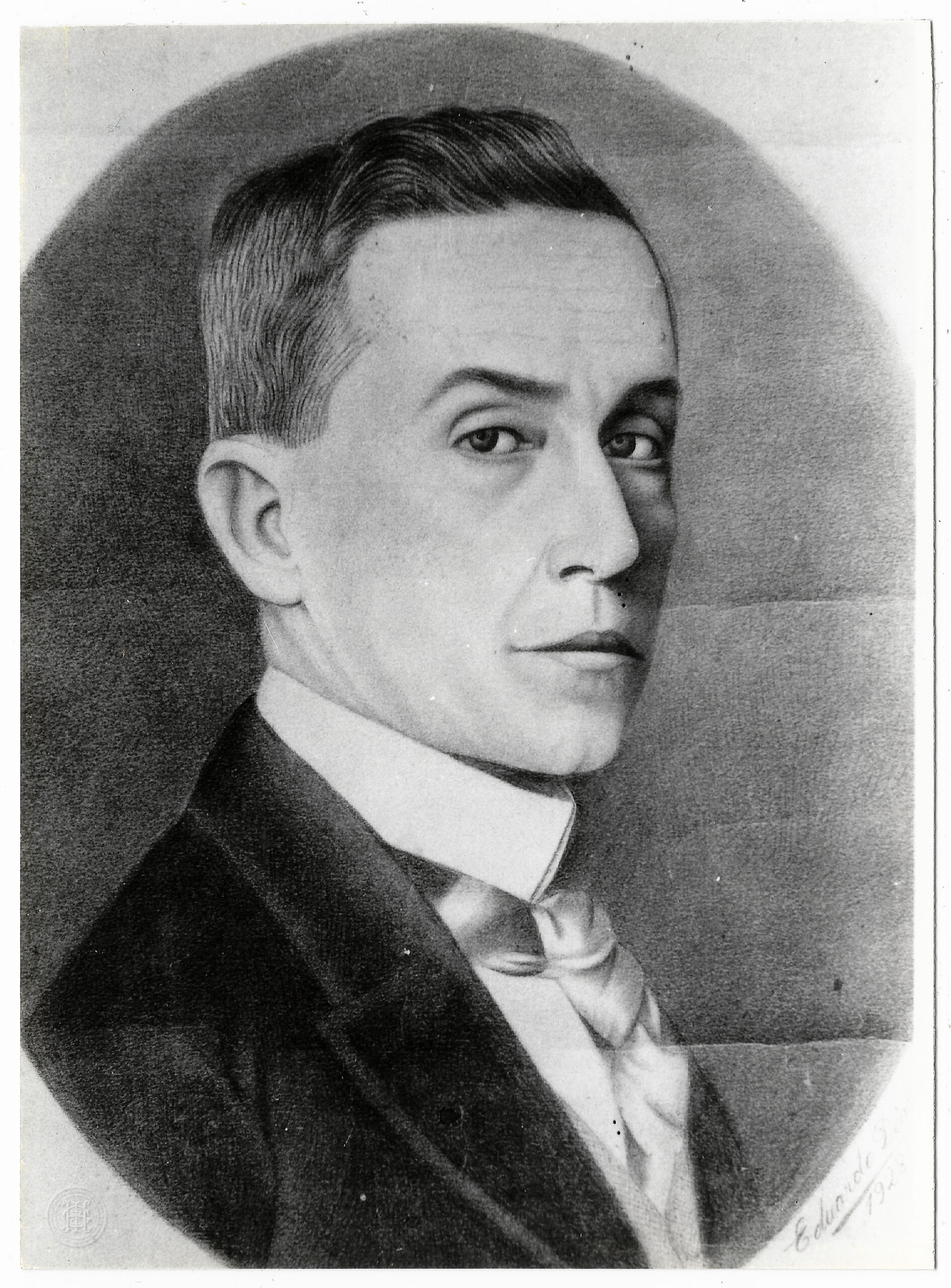 A indumentária é formal, composta por paletó escuro, camisa clara de colarinho alto e gravata escura. A técnica pictórica original, transposta para o suporte fotográfico, evidencia o uso de luz e sombra para conferir volume ao rosto e sobriedade à expressão. O fundo da composição é neutro e escuro.