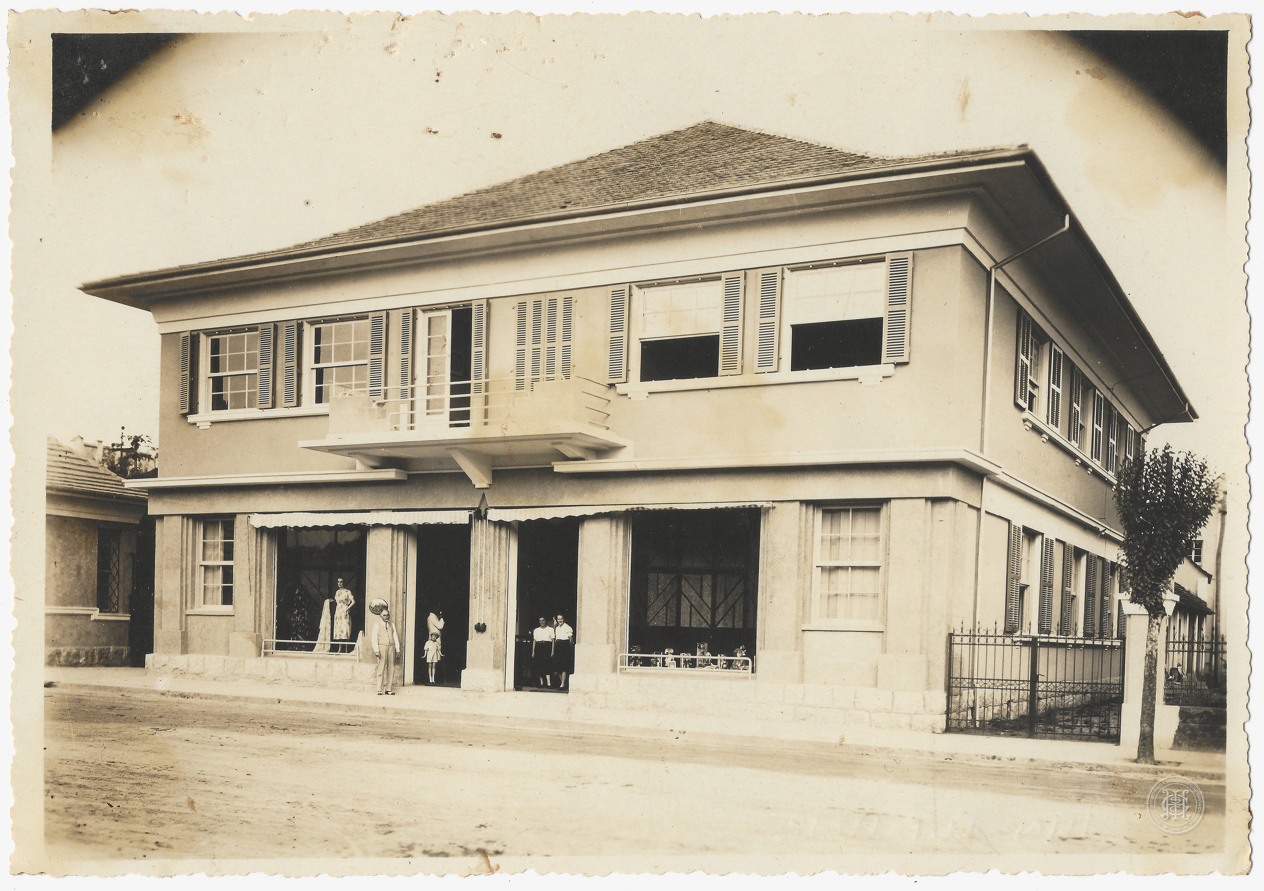 Gênero Fotográfico, Fotografia Documental, Brusque, Santa Catarina, Buettner, Loja Buettner, Administração Geral Buettner, Georg Völl, Edgar von Buettner, Arquitetura e Obras, Patrimônio Comercial e Industrial, Edifícios Comerciais, Vitrines, Toldos, Sacadas, Janelas com Venezianas, Paisagem Urbana, Vestuário Histórico, Grupos Sociais e Anônimos, 1938, Século XX, História do Comércio, Memória Social, Desenvolvimento Urbano
