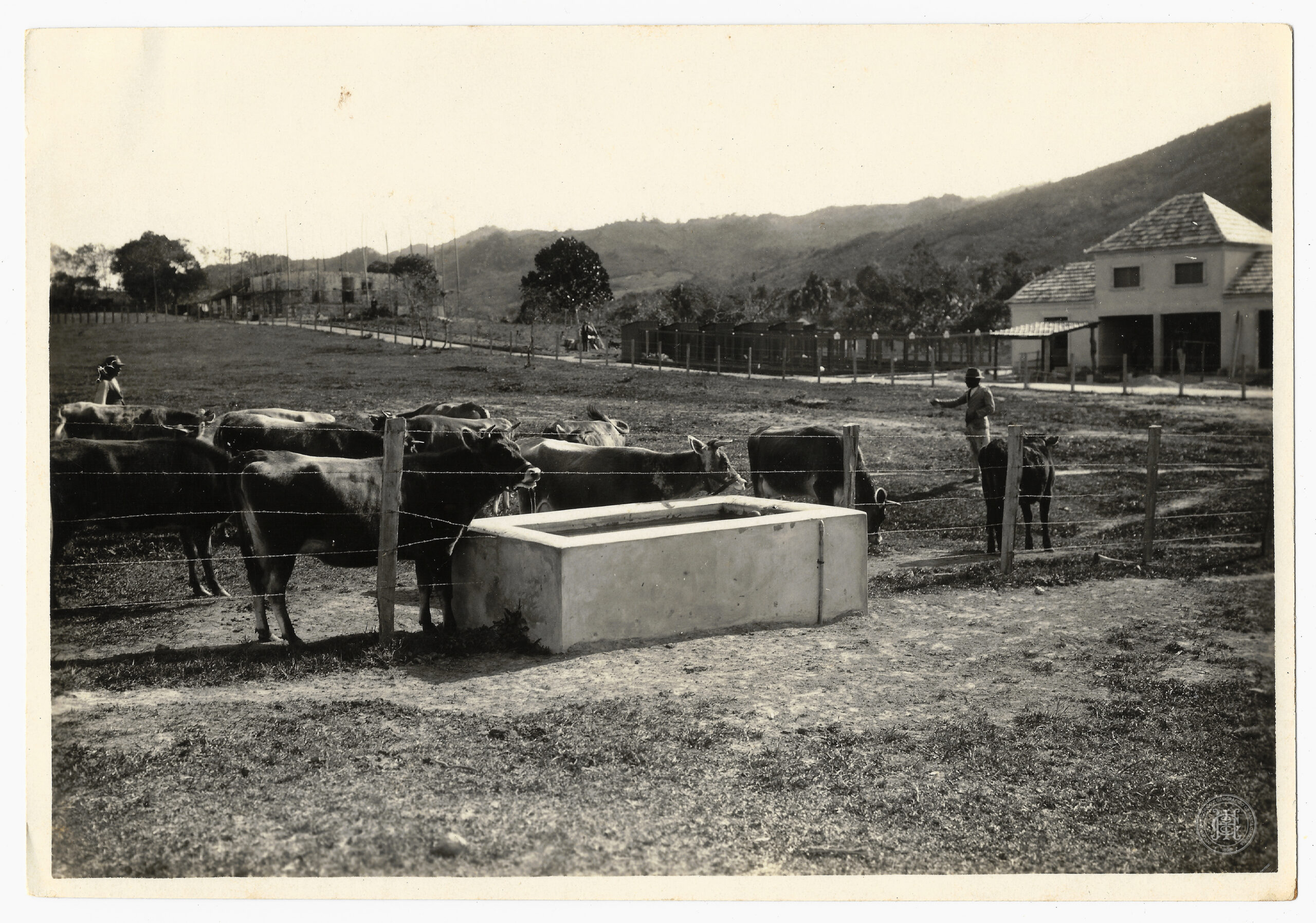 Posto Zootécnico Dr. Assis Brasil, Zootecnia, Bovinos, Rebanho, Pecuária, Florianópolis, Bairro Carvoeira, Trindade, Santa Catarina, Hercílio Luz, Paisagem Rural, Arquitetura Rural, Engenho, Fazenda, Pastagem, Bebedouro de Concreto, Cerca de Arame, Relevo, Morro, A. Carmo, Fotografia Documental, UFSC