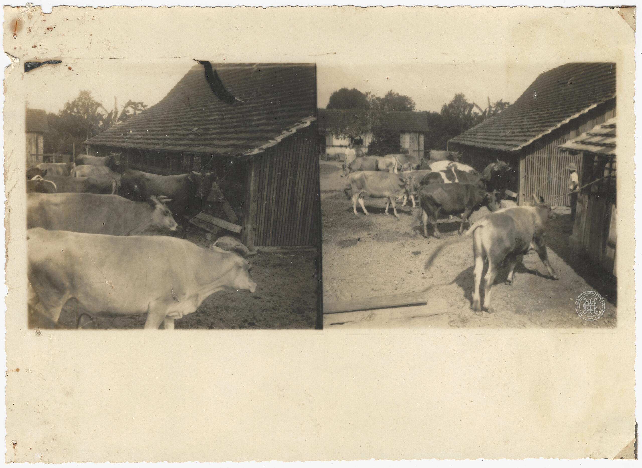 Ao fundo, identificam-se outras construções rurais de pequeno porte e uma vegetação arbórea densa. A iluminação é natural e difusa, projetando sombras suaves no solo. A disposição das imagens sugere um registro sequencial ou documental das atividades cotidianas da pecuária local.