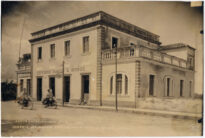 No pavimento térreo, fixada a um poste de madeira, observa-se uma placa circular com o logotipo da marca "Esso", e à esquerda, outra placa com a inscrição "Mobiloil". Em primeiro plano, a via pública de terra batida apresenta o registro de dois sujeitos em movimento sobre motocicletas, cujas silhuetas aparecem borradas devido ao tempo de exposição da fotografia. Um terceiro sujeito está sentado no degrau de uma das portas de acesso.