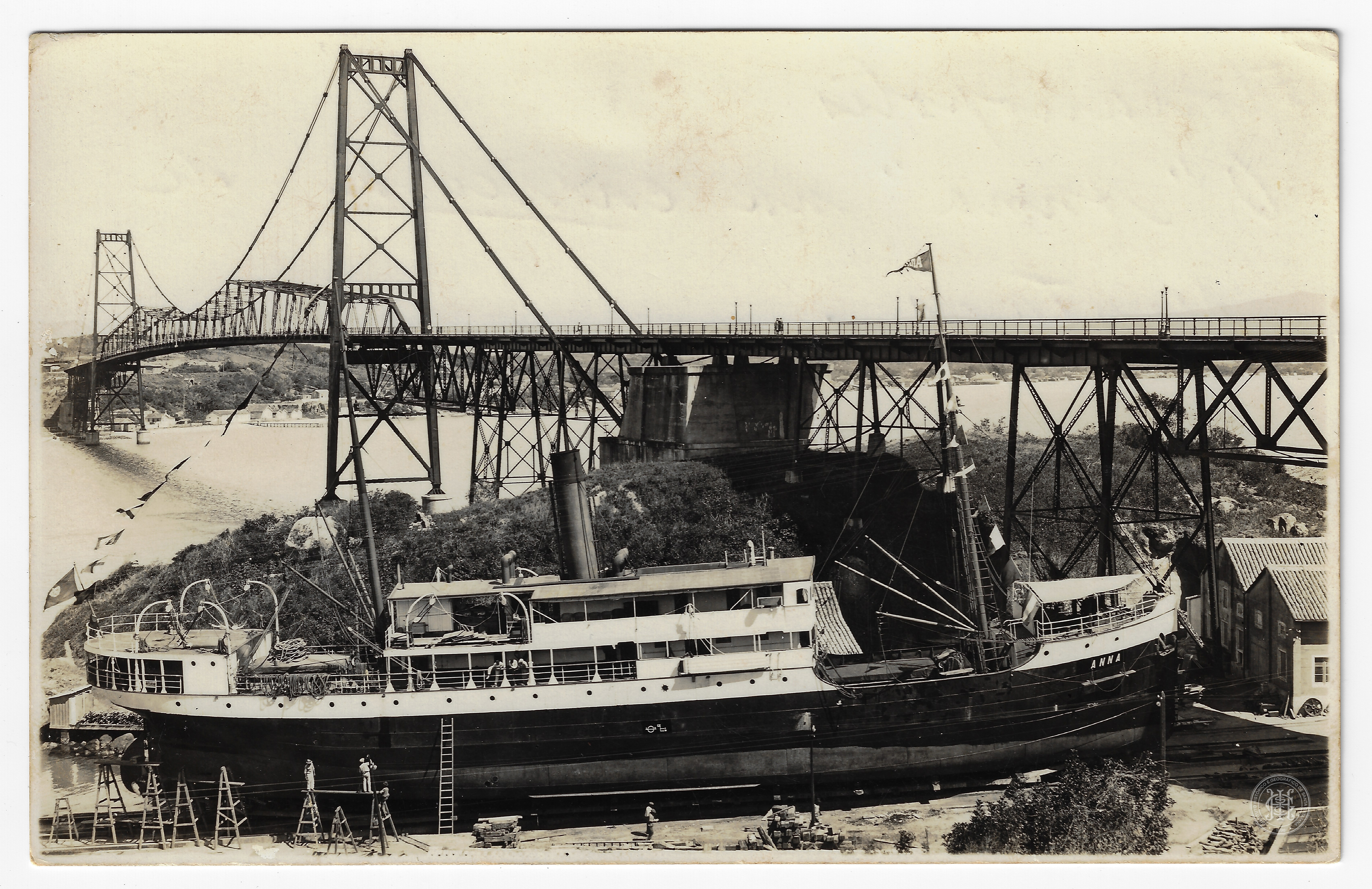Navio a Vapor Anna, Empresa Nacional de Navegação Hoepcke, Ponte Hercílio Luz, Florianópolis, Santa Catarina, Infraestrutura e Engenharia, Ponte pênsil, Estaleiro, Carreira de Arataca, Indústria Naval, Manutenção de Embarcações, Trabalhadores, Casco, Convés, Vapor, Transporte Marítimo, Baía Norte, Promontório, Rocha, Vegetação, Arquitetura, Edificações, Patrimônio Cultural, Cartão-Postal