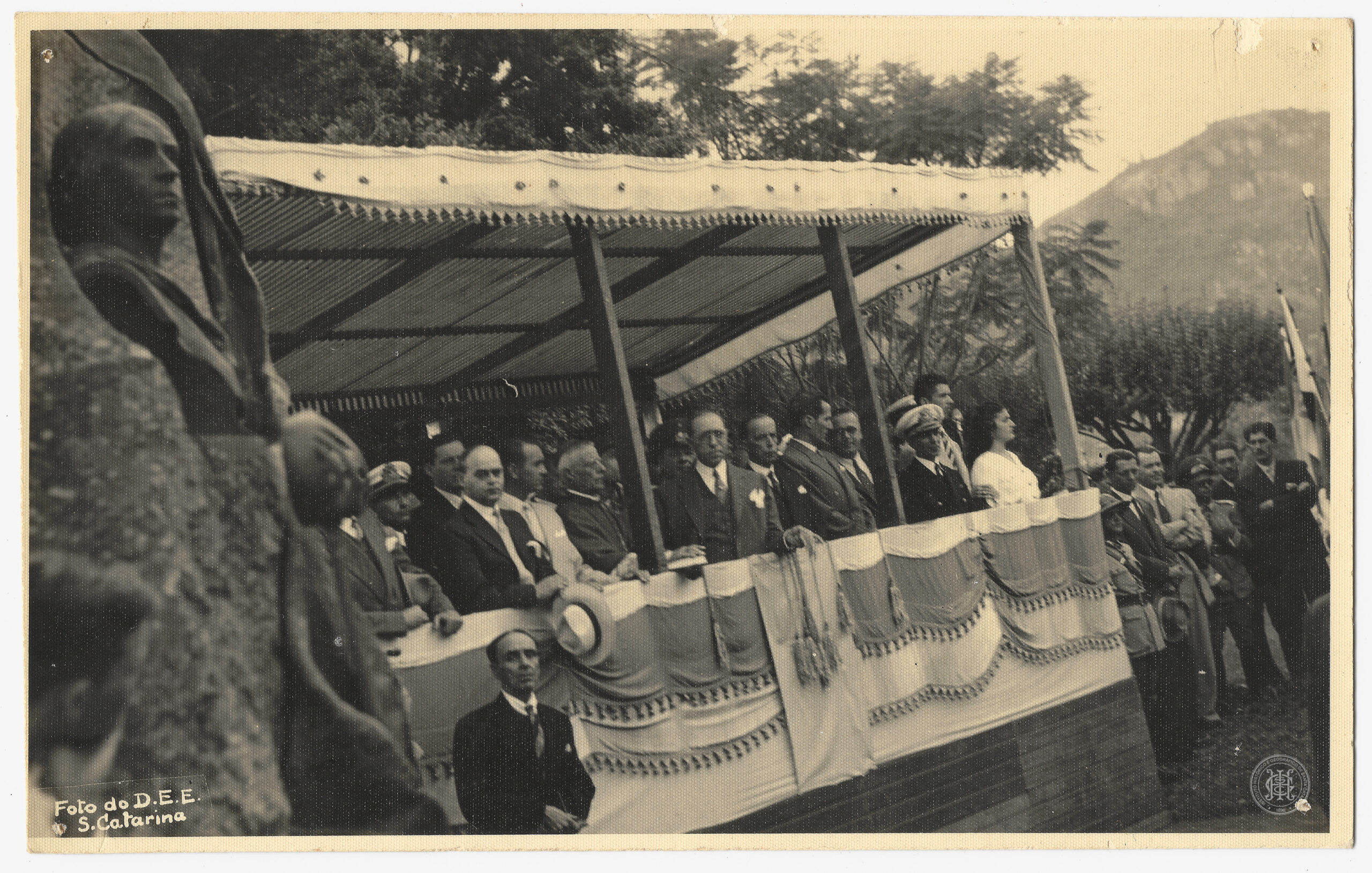 A composição é marcada, em primeiro plano à esquerda, pelo perfil de um busto integrante do monumento à Anita Garibaldi. No plano médio, o palanque de madeira, coberto por telhas onduladas e decorado com tecidos claros e franjas escuras, abriga diversas autoridades e personalidades dispostas lateralmente. Entre os presentes, identifica-se o Interventor Nereu Ramos ao centro; à sua esquerda, o Arcebispo Dom Joaquim Domingues de Oliveira; e à sua direita, o Desembargador João da Silva Medeiros Filho.