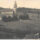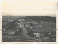 Em primeiro plano, observa-se uma área de terreno irregular com afloramentos rochosos à esquerda e uma edificação isolada em madeira à direita, cercada por uma delimitação de propriedade. Ao longo da via central e nas ruas adjacentes, dispõem-se diversas edificações predominantemente residenciais, de pequeno porte, com telhados em duas ou quatro águas.