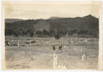 A imagem organiza-se em planos sucessivos que evidenciam a atividade agropecuária e o relevo local: em primeiro plano, observa-se um terreno gramíneo pontuado por diversos tocos de árvores cortados e restos de madeira, indicando área de desbravamento. No plano médio, encontram-se animais (bovinos e equinos) dispersos pela pastagem, alguns próximos a cercas de madeira que delimitam o espaço. Diversas árvores isoladas e palmeiras distribuem-se pela área aberta.