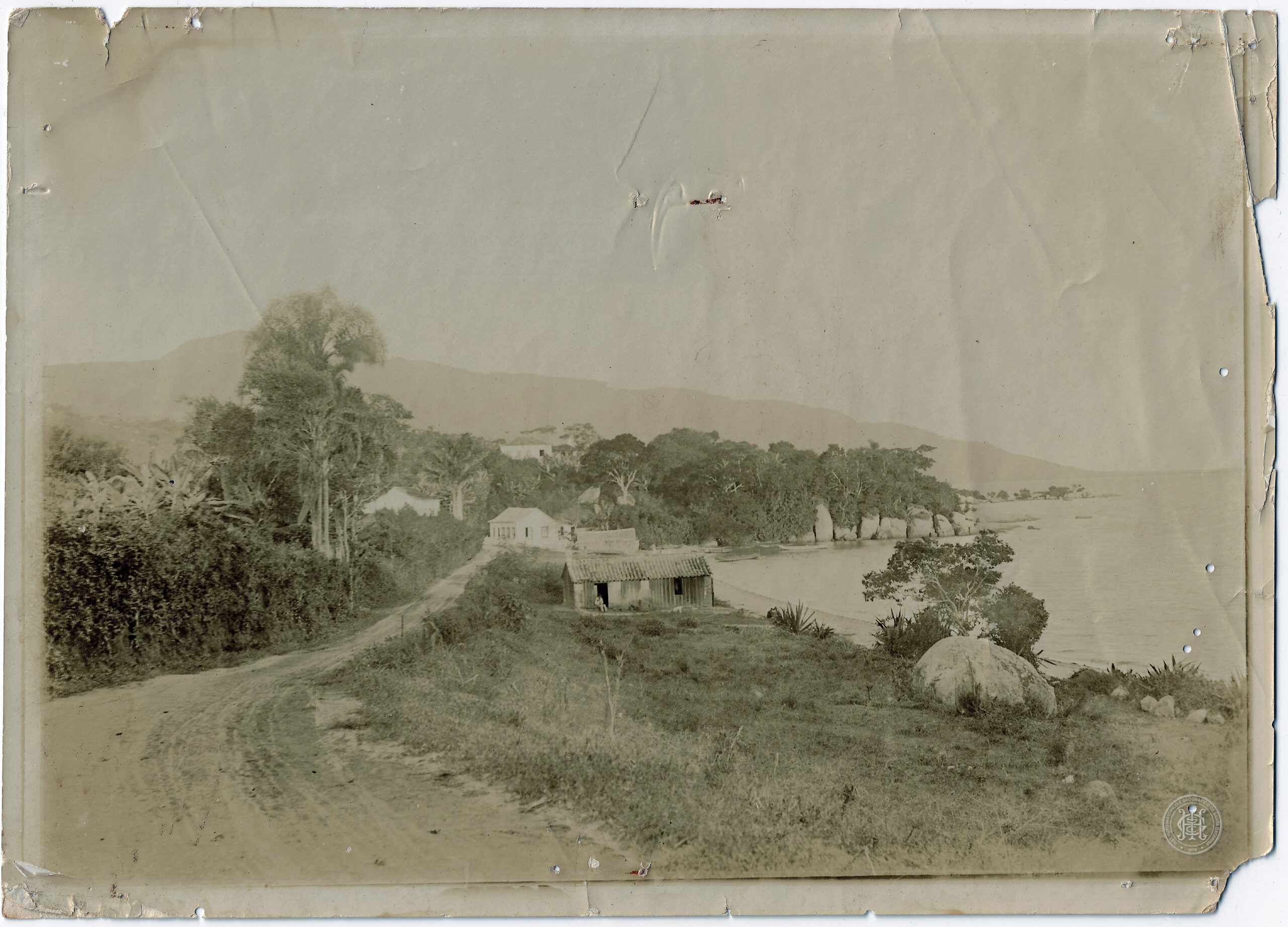 No plano médio, à direita da estrada, observa-se uma pequena construção de madeira com cobertura de telhas, posicionada próxima à faixa de areia. Mais ao fundo, ao longo da via, notam-se outras edificações de alvenaria em estilo simples. A faixa de areia é estreita e limitada por uma linha d'água calma à direita.