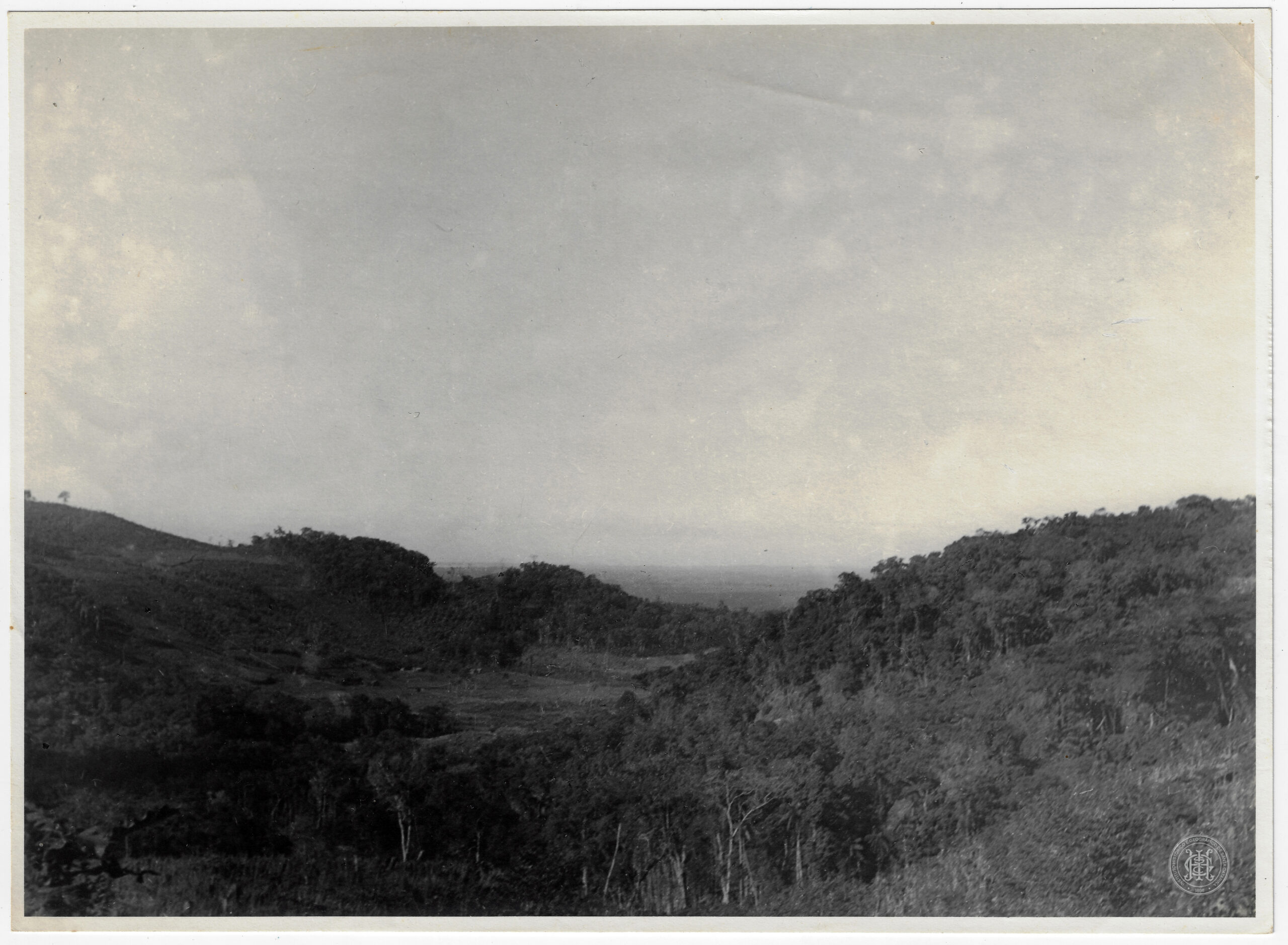 O plano de fundo revela uma linha de horizonte baixa, onde as formações montanhosas se suavizam em direção a uma planície distante sob um céu amplo, que ocupa a metade superior da imagem. A iluminação é uniforme, permitindo a percepção das texturas das massas de vegetação e das variações topográficas do terreno.