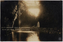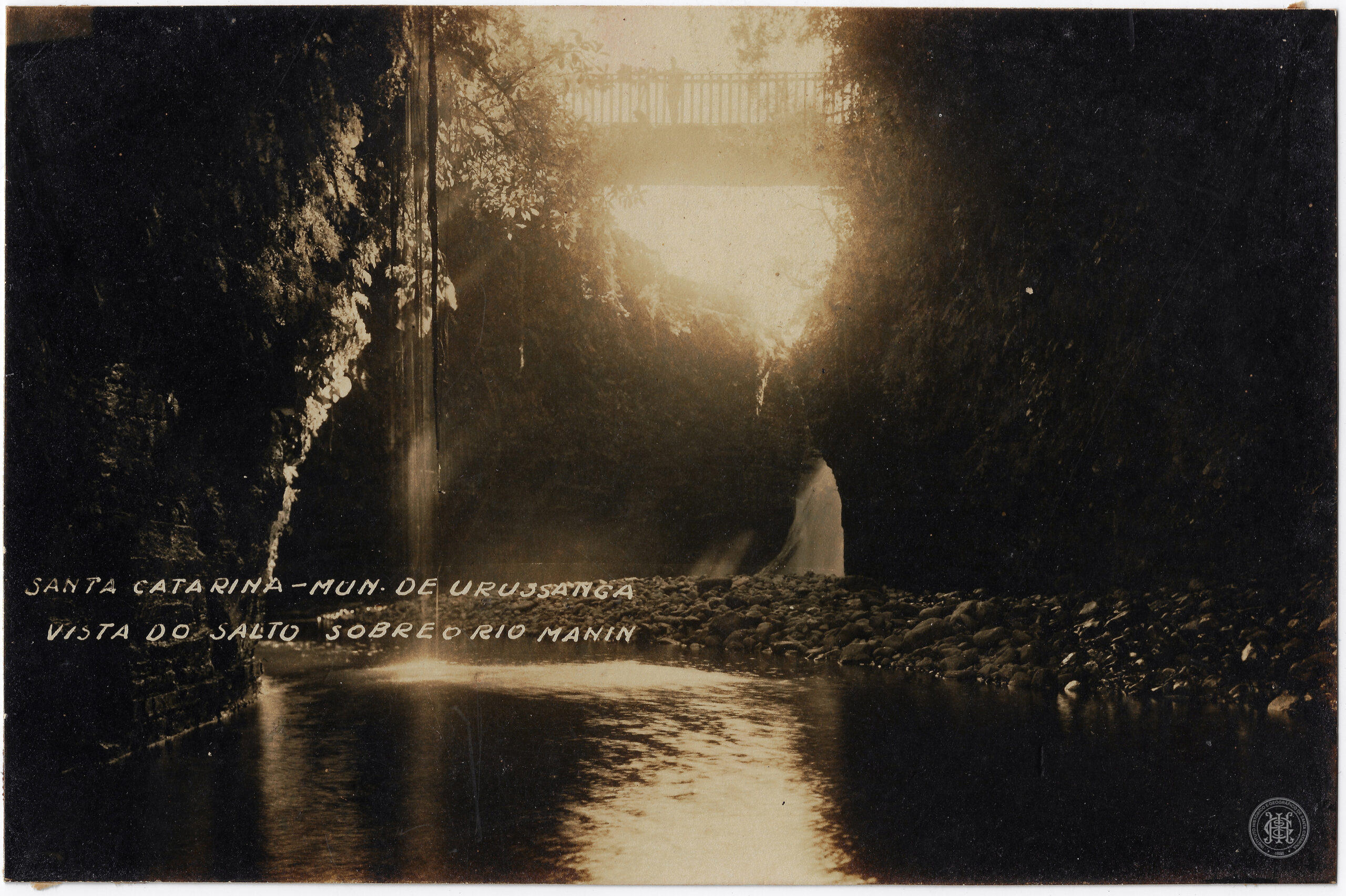 A vegetação arbórea encobre as bordas superiores dos paredões. No canto inferior esquerdo do anverso, consta a legenda impressa em letras brancas: "SANTA CATARINA — MUN. DE URUSSANGA / VISTA DO SALTO SOBRE O RIO MANIN"