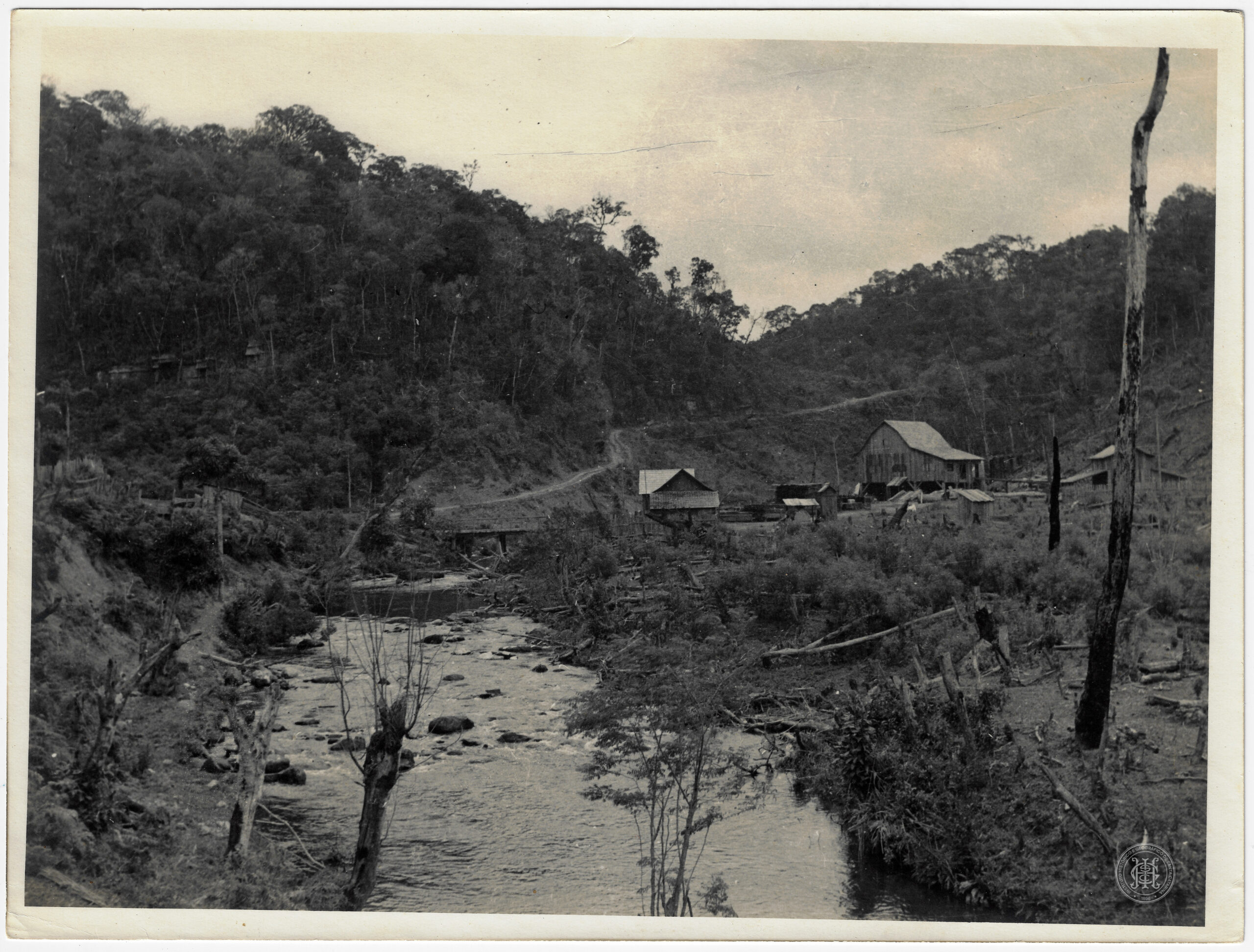 Paisagem Natural, Elementos Naturais, Rio, Curso d'água, Leito Pedregoso, Margem, Mata Atlântica, Floresta, Vegetação Nativa, Encosta, Morro, Relevo, Povoamento Rural, Habitação Rural, Construção de Madeira, Galpão, Ponte de Madeira, Estrada de Terra, Vida Rural, Cotidiano Rural, Colonização, Santa Catarina.