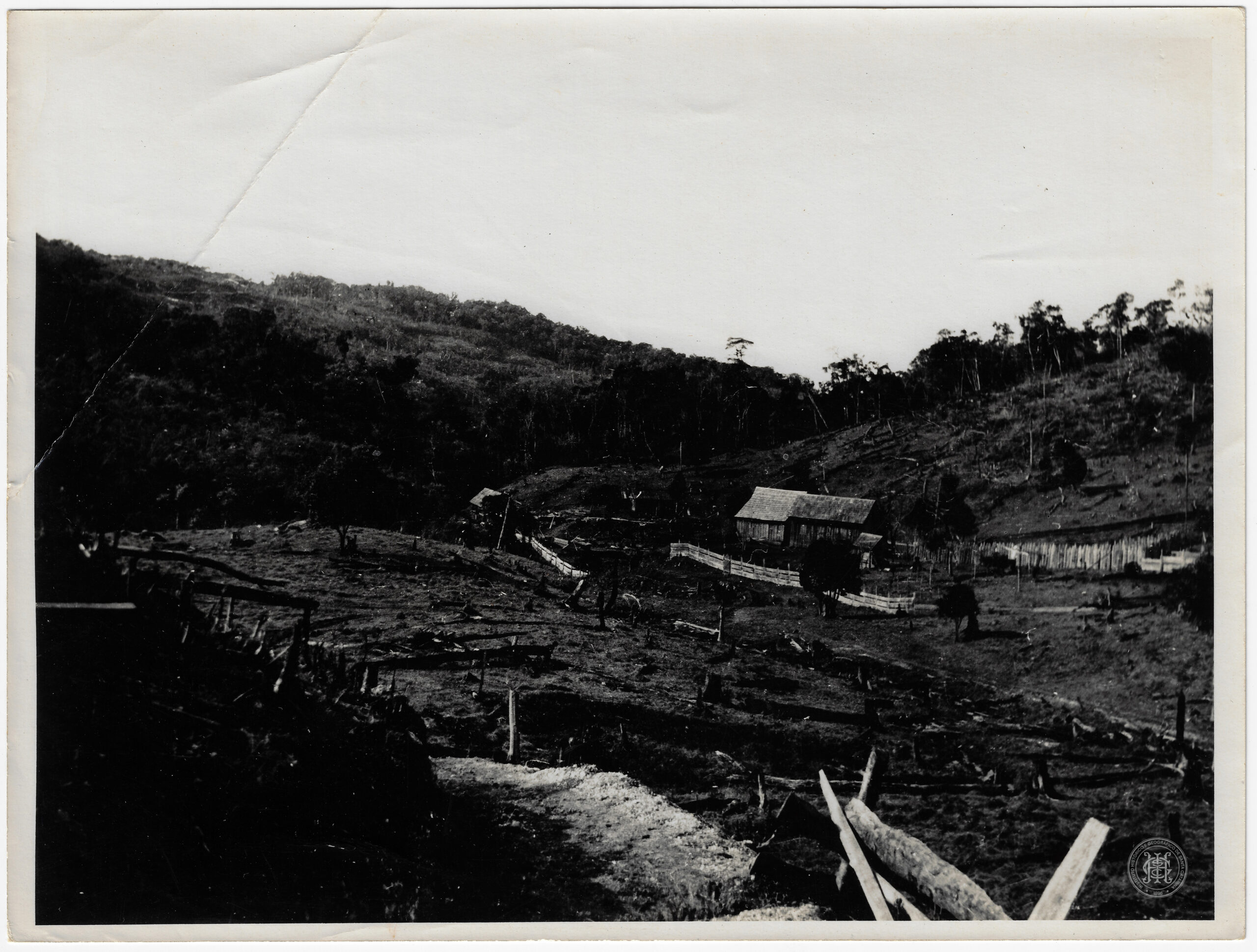 Paisagem, Paisagem Rural, Espaços Rurais, Relevo, Encosta, Morro, Vegetação, Mata Nativa, Desmatamento, Troncos, Árvores, Elementos Naturais, Arquitetura Rural, Patrimônio Privado, Casa de Madeira, Construção de Madeira, Cerca, Delimitação de Terra, Propriedade Rural, Santa Catarina, Gênero Fotográfico, Documentação Fotográfica