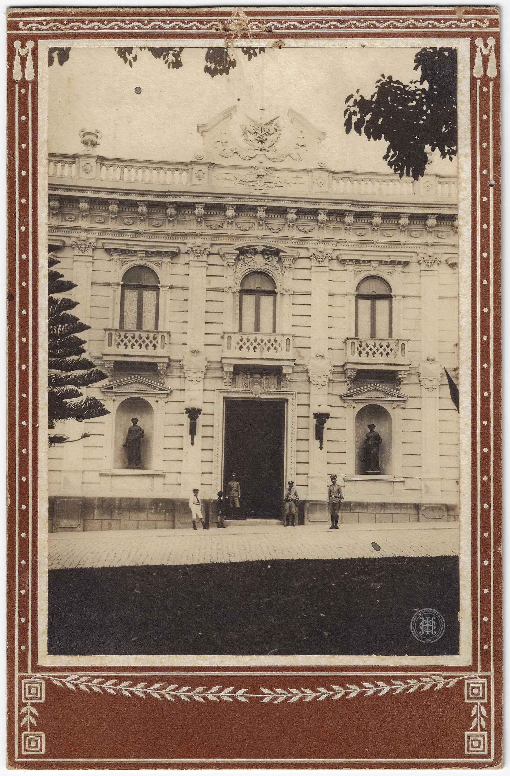 Esta fotografia, com bordas ornamentadas por uma moldura impressa em marrom com detalhes fitomórficos e geométricos, apresenta a fachada frontal do Palácio Cruz e Sousa, em Florianópolis.