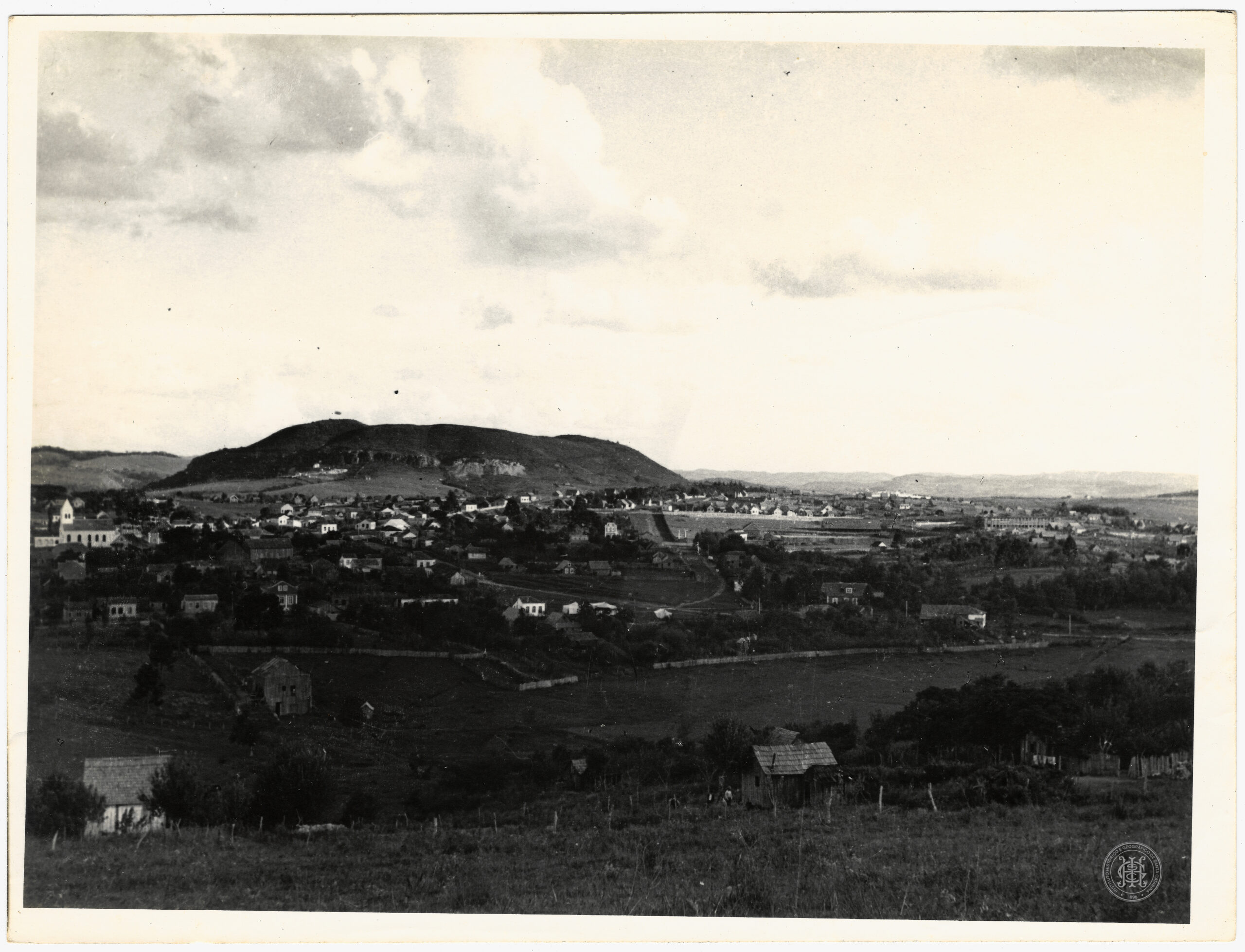 Vista panorâmica elevada de um núcleo urbano em Santa Catarina, integrado a um relevo acidentado. A composição é estruturada em três planos principais. No primeiro plano, observa-se uma área rural ou periférica com terreno inclinado, vegetação rasteira, cercas de madeira e pequenas edificações rurais esparsas, construídas predominantemente em madeira com telhados de duas águas.