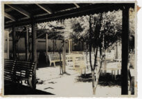 Área de lazer externa com mobiliário sob uma estrutura de cobertura e vegetação no Parque Olímpia, em Brusque, Santa Catarina. A composição é capturada a partir de uma área sombreada em primeiro plano, delimitada por colunas verticais de madeira e uma cobertura com acabamento em lambrequim recortado na parte superior.
