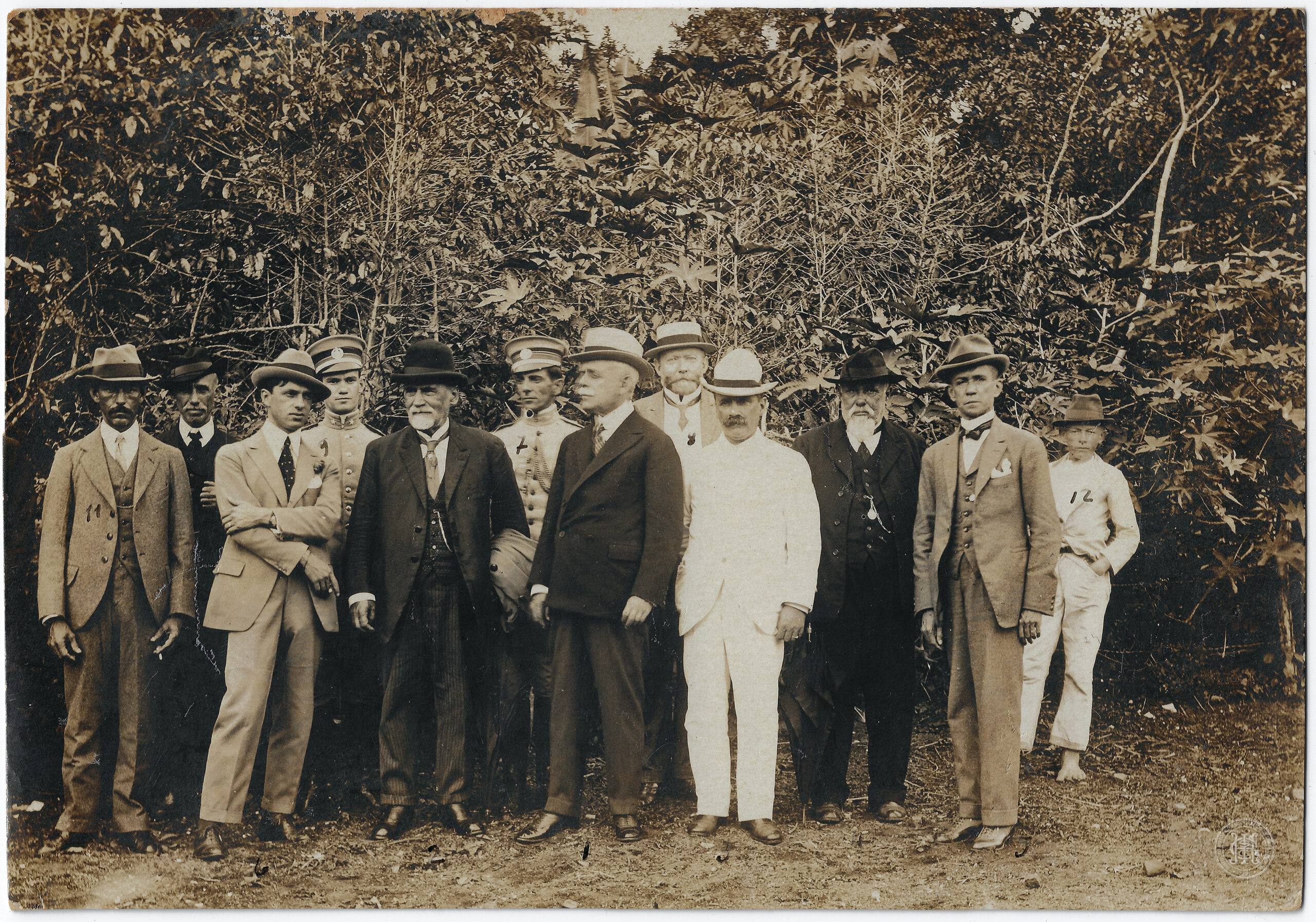 Retrato coletivo, Grupo, Homens, Menino, Passeio, Lazer, Hercílio Luz, Hercílio Pedro da Luz, Coronel Pereira e Oliveira, João Carvalho, José Boiteux, José Artur Boiteux, Adolpho Konder, Autoridades, Políticos, Militares, Ribeirão da Ilha, Florianópolis, Santa Catarina, Vegetação, Mata, Exterior, Trajes formais, Chapéus, Século XX