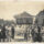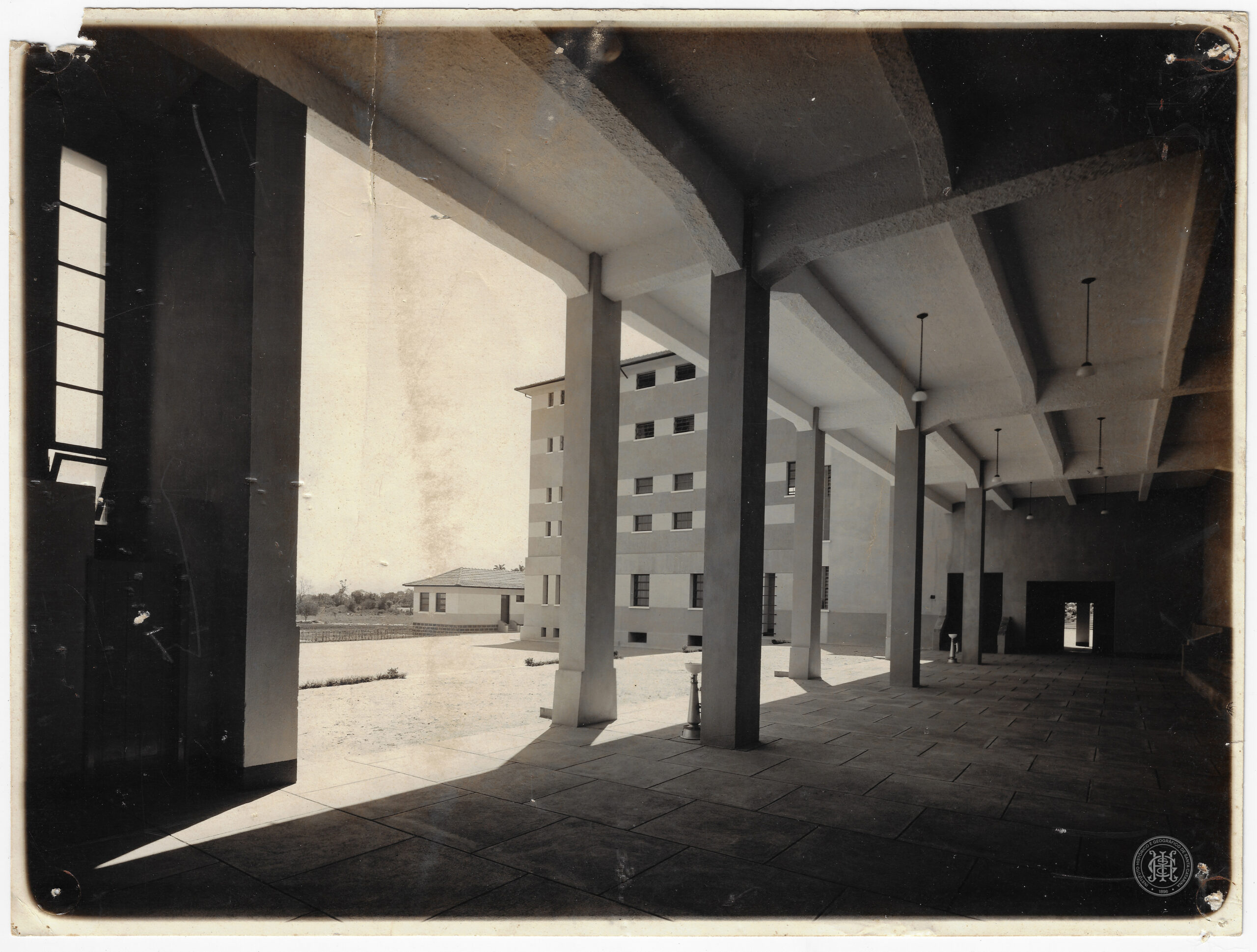 Esta fotografia registra o pátio coberto do Abrigo de Menores, em Santa Catarina. A imagem é composta a partir de uma perspectiva interna sob uma galeria monumental, caracterizada por uma série de pilares de seção quadrada que sustentam uma cobertura de concreto com vigas aparentes em grelha.