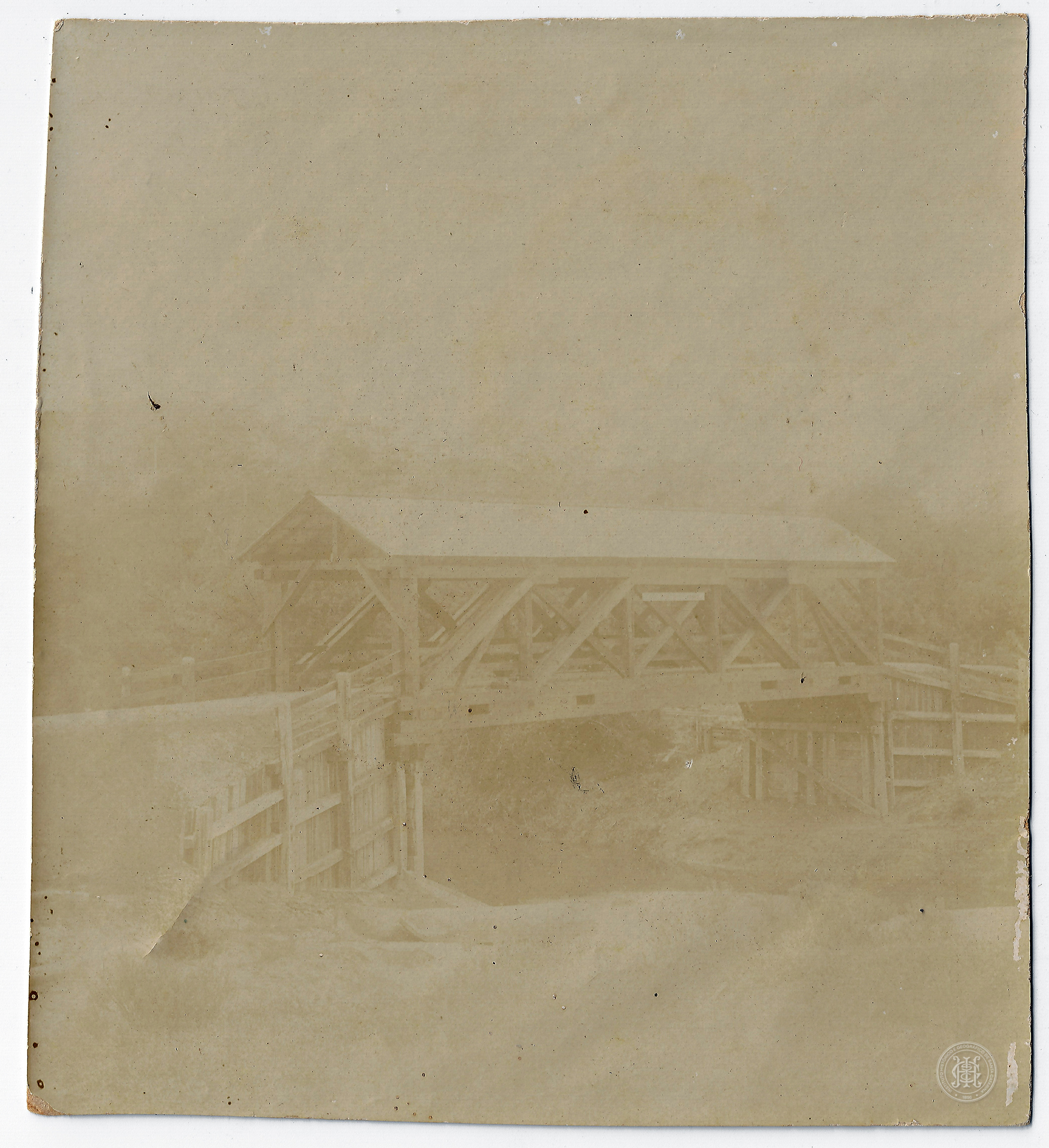 A composição centraliza a estrutura arquitetônica, que apresenta telhado de duas águas e treliças laterais em formato de "X". A ponte atravessa um curso d'água não identificado, sustentada por pilares de madeira visíveis abaixo da plataforma. No primeiro plano, à esquerda e à direita, observam-se as cabeceiras da ponte com proteções laterais em ripas de madeira dispostas horizontalmente.