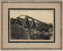 Sobre a via férrea, no plano médio, observam-se quatro figuras masculinas em pé; os sujeitos vestem indumentária formal composta por paletós, calças escuras e chapéus. No primeiro plano, à esquerda, destaca-se um talude de terra com vegetação rasteira que serve de base para a estrutura. Abaixo da ponte, a margem oposta apresenta um paredão rochoso vertical que ladeia o rio, cujas águas calmas refletem a luz e a treliça.
