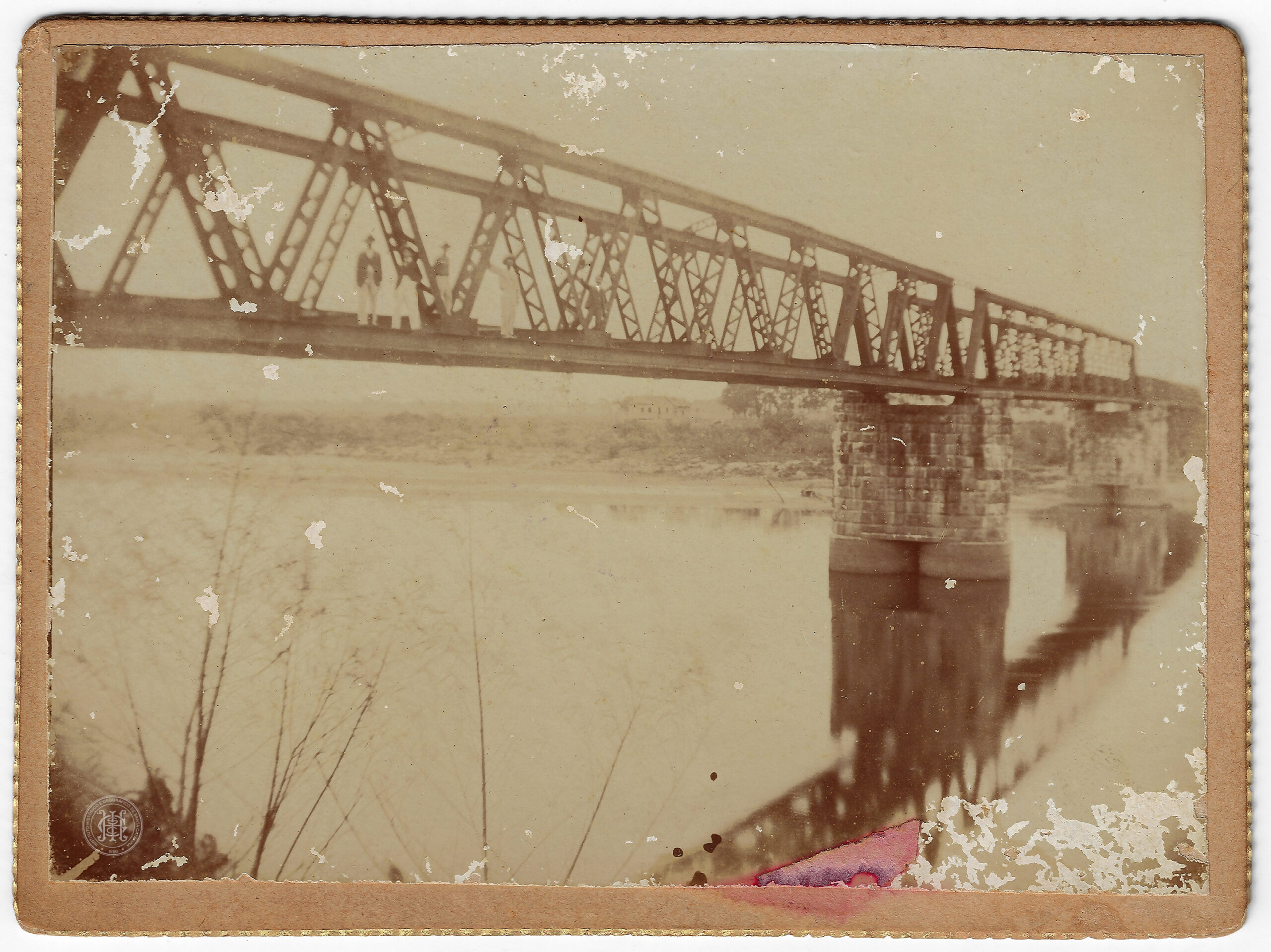 Ponte ferroviária de estrutura metálica sobre um corpo d'água em Santa Catarina. A imagem, capturada em plano médio e perspectiva lateral, destaca a engenharia da treliça metálica que se estende horizontalmente por toda a composição. Sobre a estrutura da ponte, identificam-se pequenas figuras humanas (sujeitos) posicionadas entre os vãos metálicos, vestindo indumentária clara e chapéus, sugerindo uma escala da magnitude da obra.