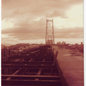 A composição organiza-se a partir de uma perspectiva central profunda, situada sobre a estrutura da ponte. Em primeiro plano e plano médio à esquerda, observa-se a armação metálica exposta composta por vigas transversais e longitudinais de aço.