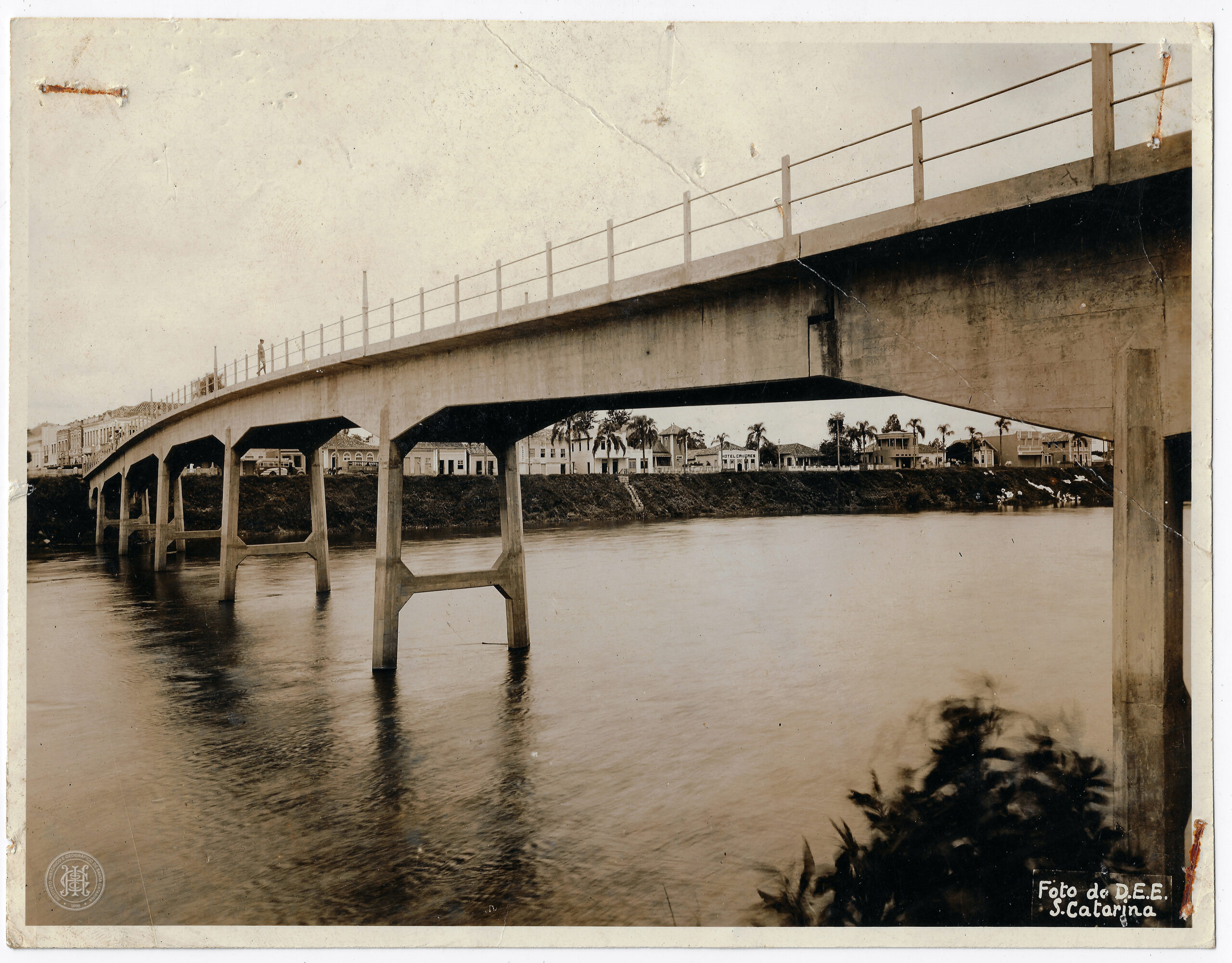 Na margem oposta, ao fundo, visualiza-se uma linha de construções urbanas compostas por casas e edifícios de um a dois pavimentos, intercalados por vegetação arbórea e palmeiras. Entre as edificações, destaca-se uma placa com a inscrição "HOTEL CAIÇARA". No canto inferior direito da imagem, consta a legenda impressa: "Foto de D.E.E. S. Catarina".