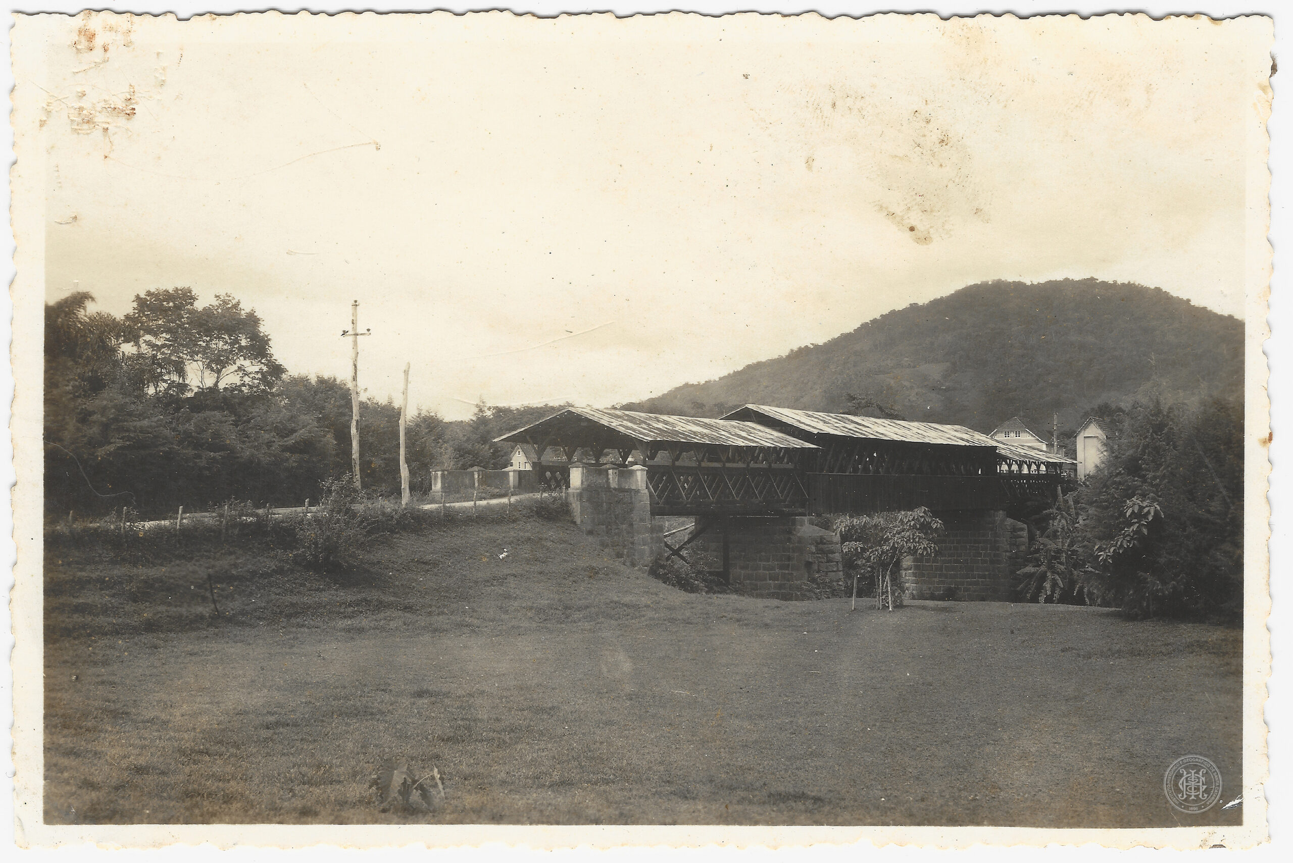 Paisagem Urbana, Paisagem Rural, Rio dos Cedros, Timbó, Santa Catarina, Vale do Itajaí, Ponte, Ponte Coberta, Ponte de Madeira, Pilares, Alvenaria de Pedra, Telhado, Arquitetura, Infraestrutura e Engenharia, Poste, Rede Elétrica, Morro, Elevação, Relevo, Vegetação, Edificações, Casas, Cartão-Postal, Década de 1930
