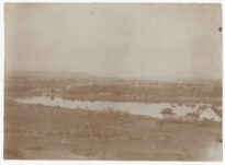 Ao fundo, na margem oposta, nota-se uma área com ocupação incipiente apresentando algumas edificações isoladas em madeira, cercas e vegetação arbórea esparsa, sob um céu de tonalidade clara e uniforme. A perspectiva é elevada, permitindo a visualização da planície e de elevações montanhosas suaves no horizonte.