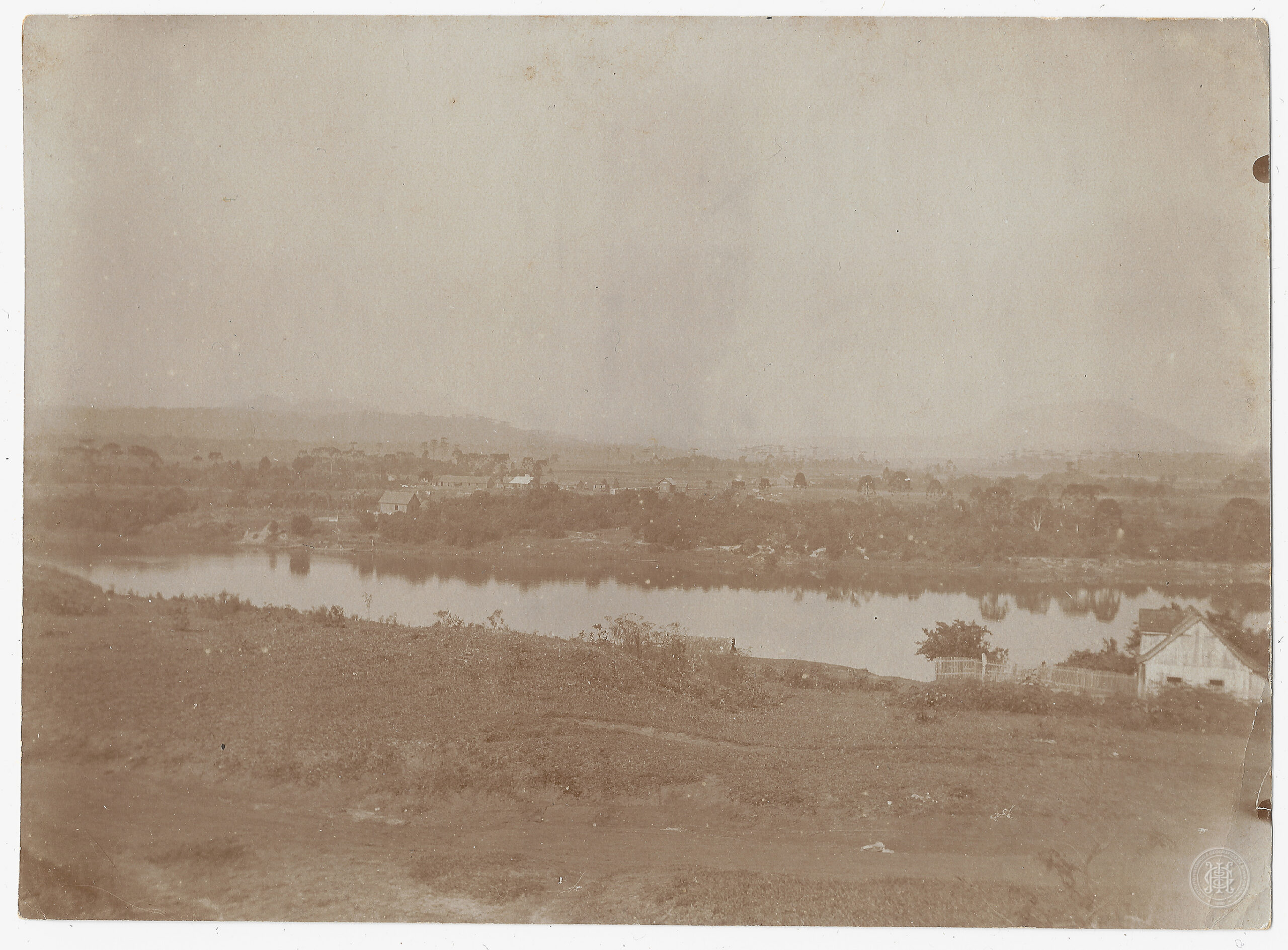 Porto União, Santa Catarina, Rio Iguaçu, Paisagem Natural, Rio, Curso d'água, Vistas, Vista Panorâmica, Relevo, Montanhas, Vegetação, Ocupação Urbana, Edificações em madeira, Fronteira, Estrada de Ferro, Ferrovia, Ponto Terminal, Infraestrutura, Engenharia, E.F.S.P.R.G., Estrada de Ferro São Paulo-Rio Grande, Patrimônio Ferroviário, 1904