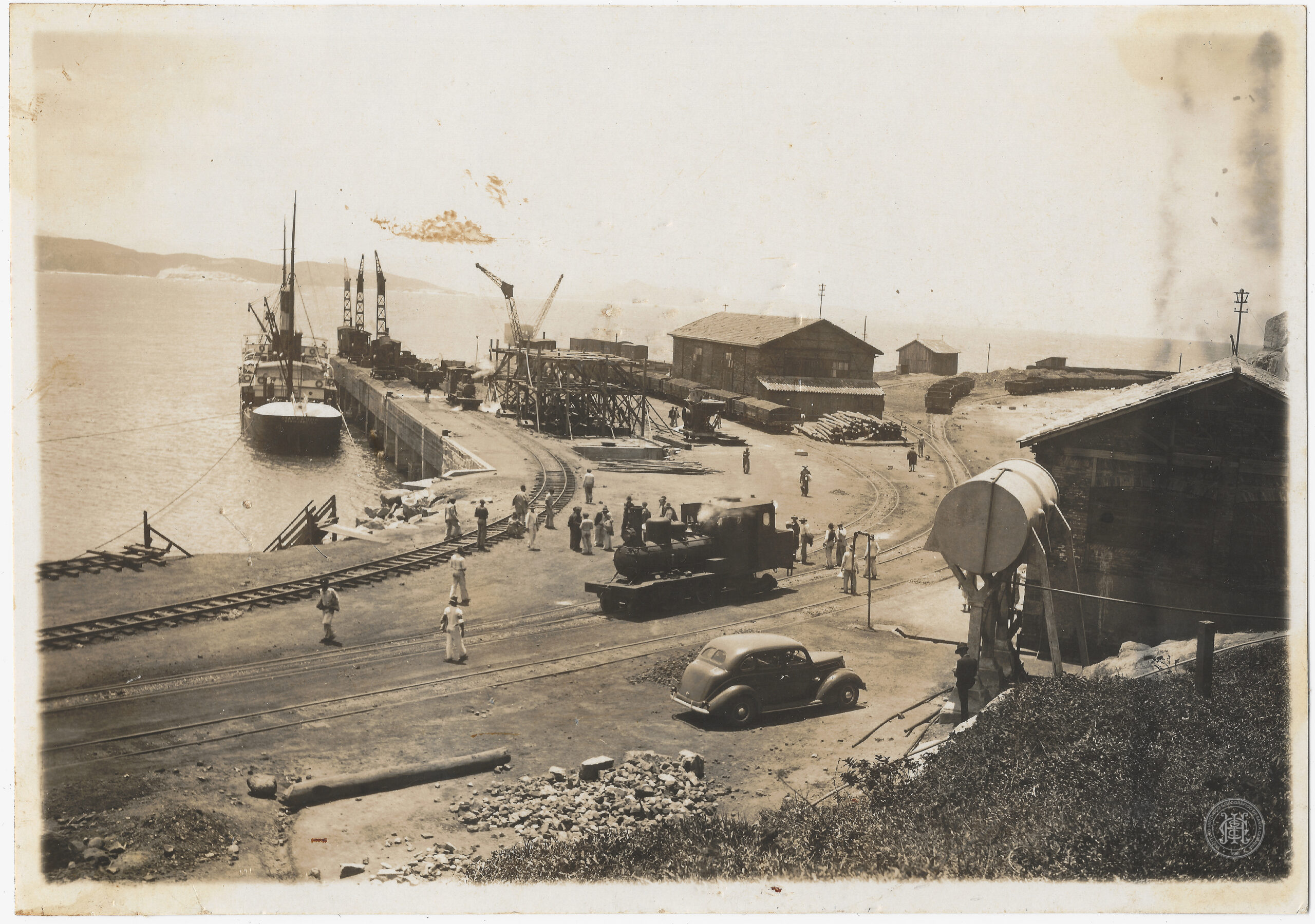Porto de Imbituba, Infraestrutura portuária, Píer, Navio, Locomotiva a vapor, Ferrovia, Trilhos, Automóvel antigo, Operários, Trabalho portuário, Pátio de manobras, Armazéns, Guindastes, Carregamento de minério, Transporte marítimo